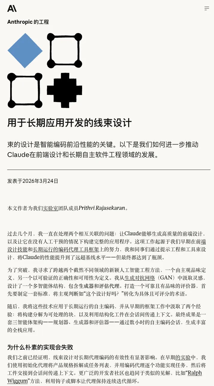 单个 AI 不擅长长期、复杂、主观 + 技术混合的任务。Anthropic 用“多智能体 + 明确分工 + 可评价标准 + 长时间运行的编排(harness)”, 让 AI 本身具备“像一个成熟产品团队一样工作的能力”。