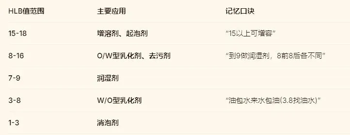 (2)表面活性剂HLB:“3.8找油水”(HLB 3-8为W/O乳化剂,8-16为O/W乳化剂);“15以上可增容”。