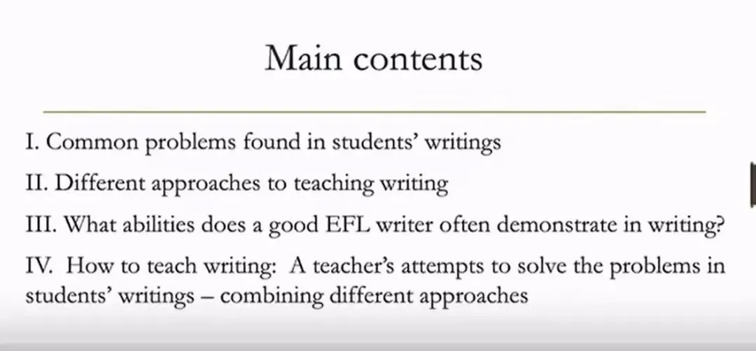 讲座主要内容:学生写作中的常见问题;不同的教学方法;优秀的二语写作者应该具备的能力;写作教学课例分享。