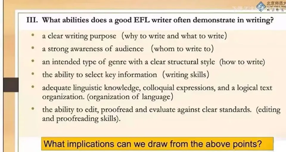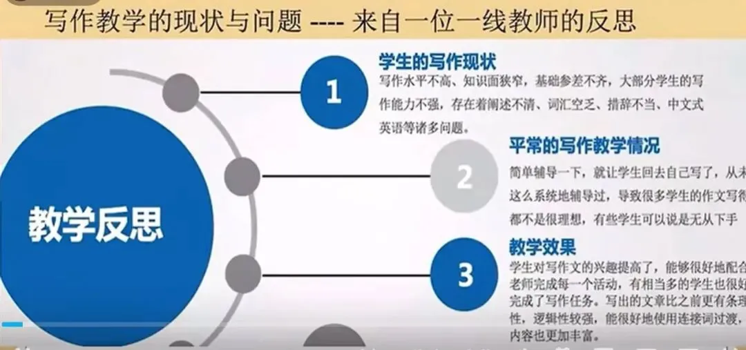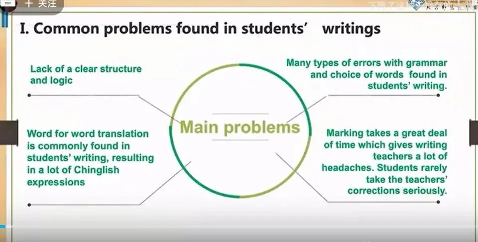 I 学生写作中的常见问题:1.缺乏清晰的结构和逻辑;2.词对词的翻译,中式英语;3.语法错误和用词不当;4.作文批改费时低效,学生没有认真对待老师作文反馈来提高自己的写作。图片是来自一位一线教师的反思。我个人认为目前写作教学最大的困难就是:1.学生英语水平不整齐,课堂很难兼顾所有学生;2.学生主动提升作文的意识不够,我很用心的从要点、结构、语言等各方面细致反馈,但是学生很抵触进行作文二次写作,应付式的写作、利用AI写作的现象很普遍;3.如何规划好一堂写作课,能够让学生在课堂上完成初稿或者重难点部分写作,减少他们的写作焦虑,利用老师和同伴的力量来自信地完成写作,而不是课后独自一人绞尽脑汁去艰难地写作。王教授在指出写作中出现问题的原因时,真是一针见血!有一句关键性的话语,我需要多去领悟:学生写作水平高低跟老师教学水平直接关联。