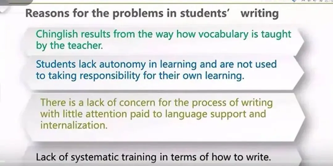 总之,写作教学欠缺系统性的训练和对过程性写作的关注,导致学生写作困难,这是非常重要的一个原因。