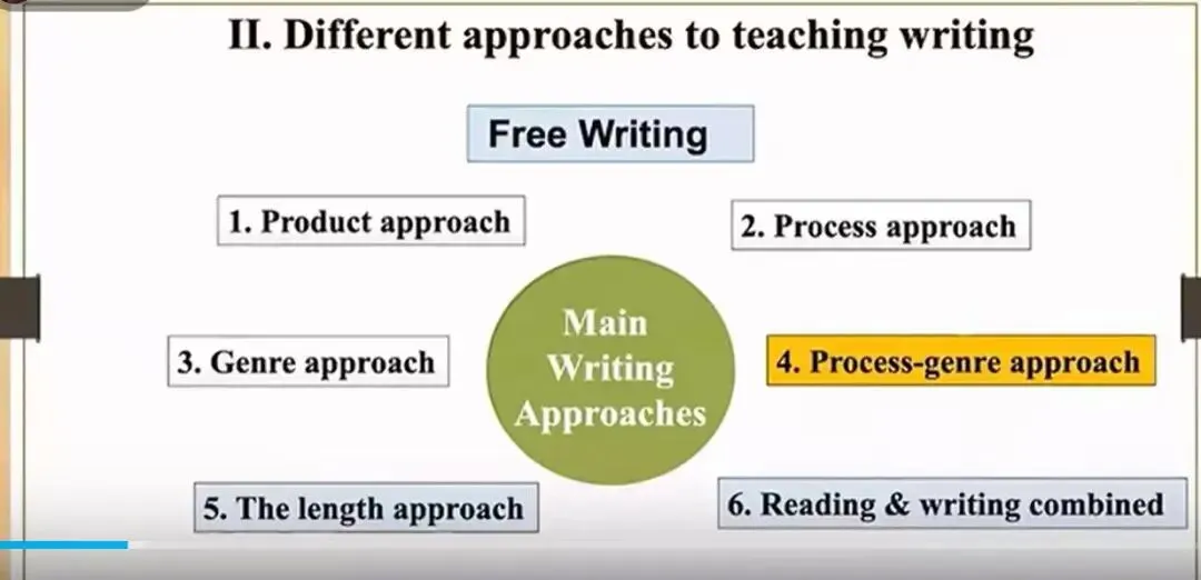 60年代product approach命题作文,70年代process approach过程性写作,90年代genre approach关注信息文体写作差异,近年:Process-genre approach。