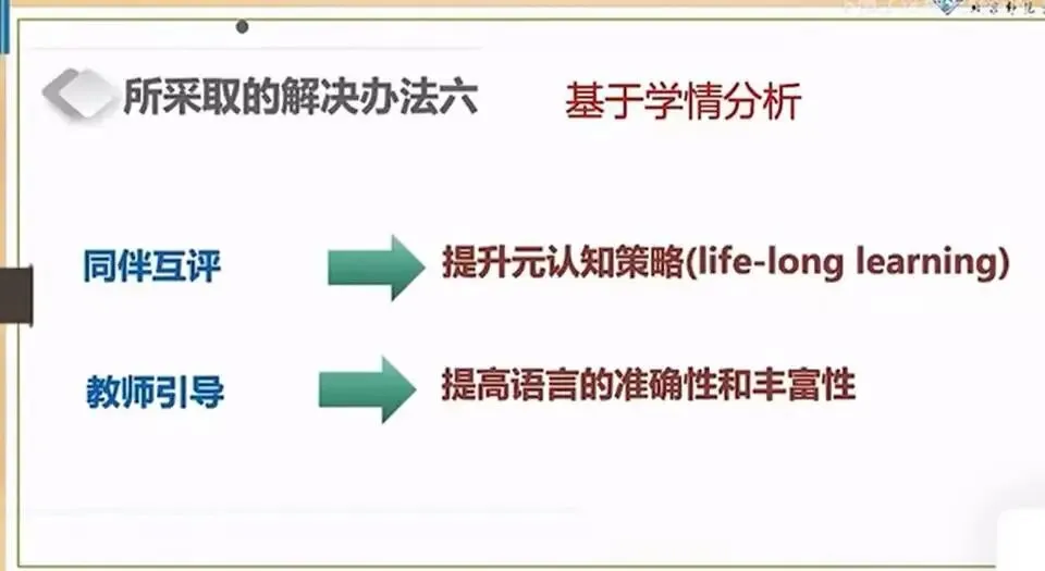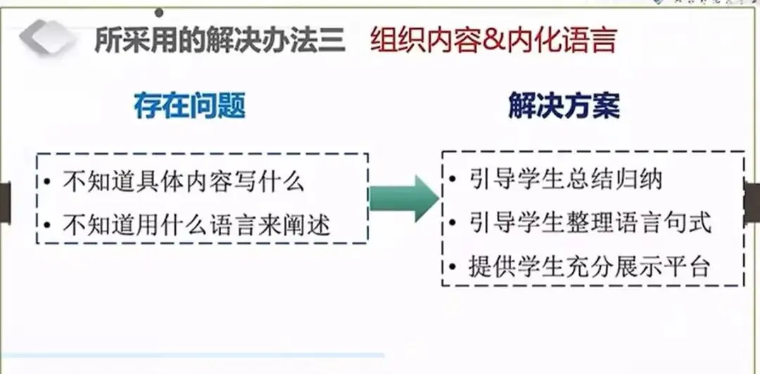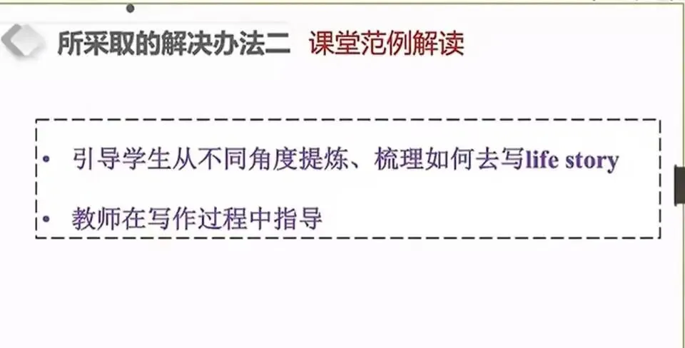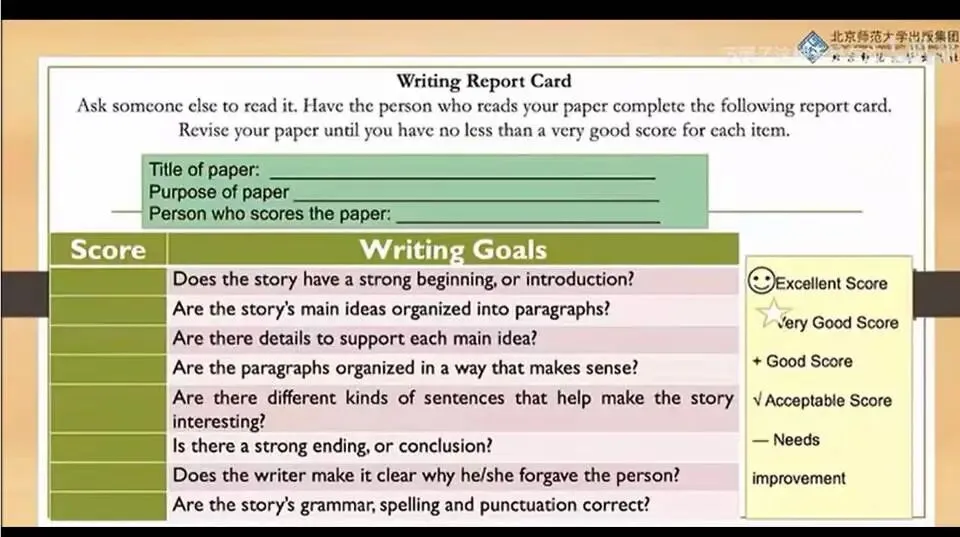 2)学生缺乏学习主动性,对自己的学习没有足够责任心。从老师的角度来反思就是:教师要进行方法指导,提高学生元认知水平,让他们主动参与写作框架建构、写作评价标准设计以及写作评价中来。