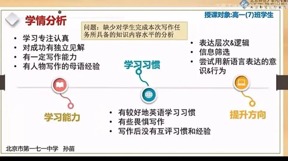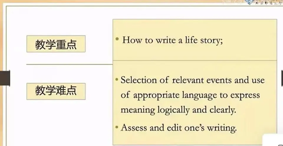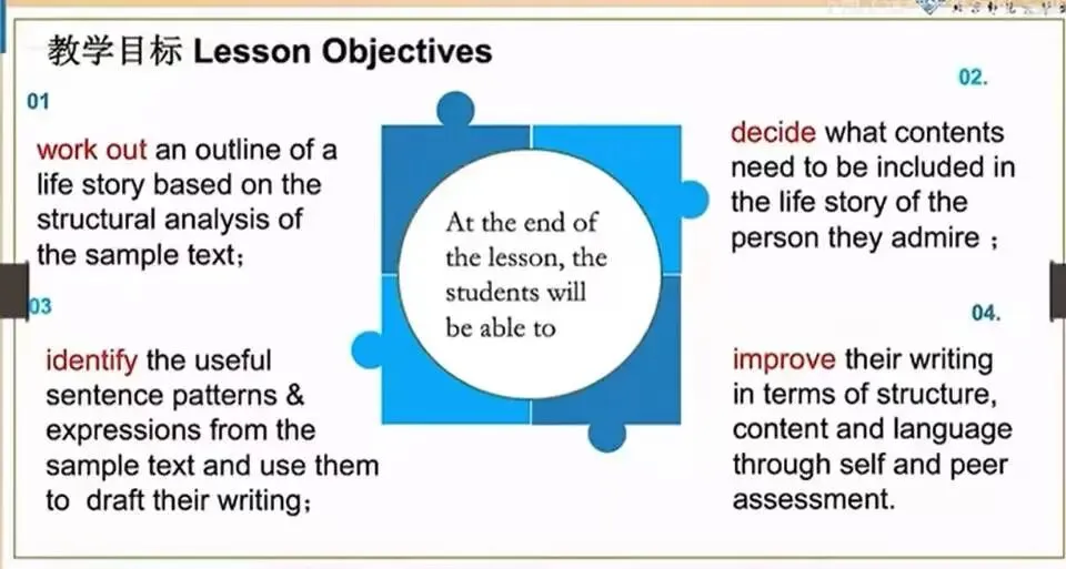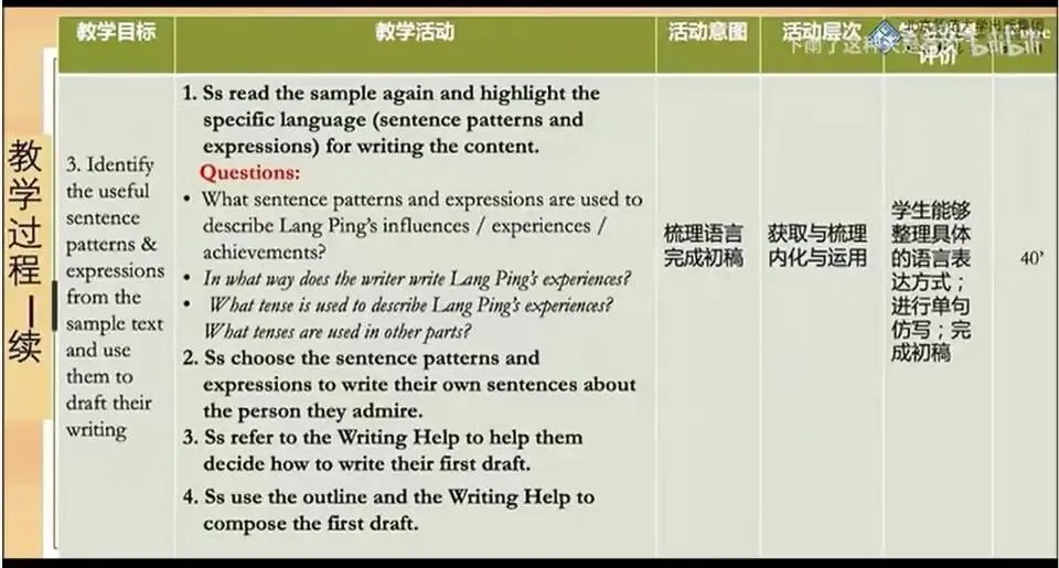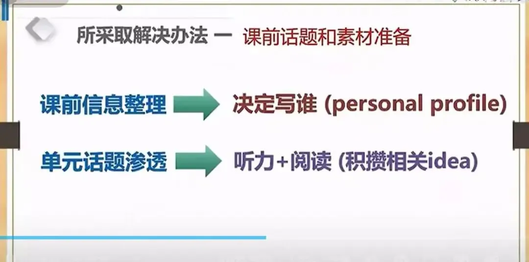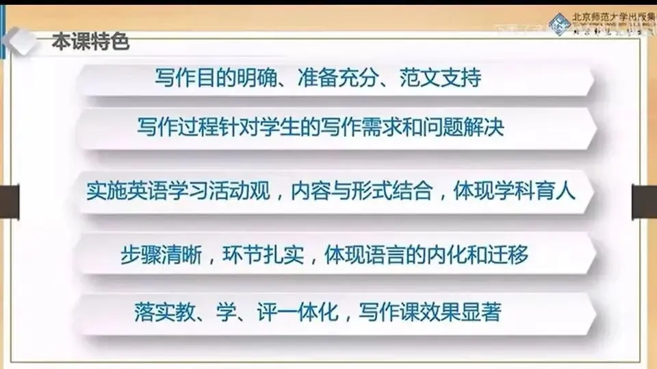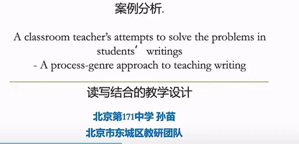 第一阶段:1.明确读者对象、写作目的--明晰交际目的(why to write and write to whom);2.文体(e-mail,post等)+ideas--明确文体和主要要点;3.分析smaple text,提供语篇层面的支持--明确结构;4.针对ideas的sentence-writing practice --准确表达语言准备。