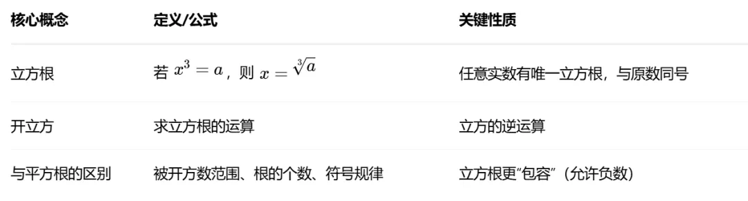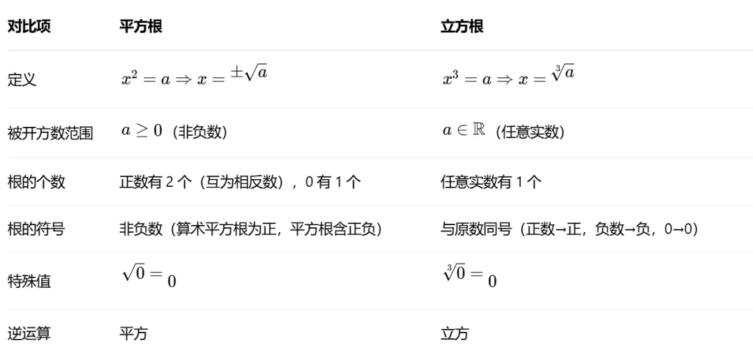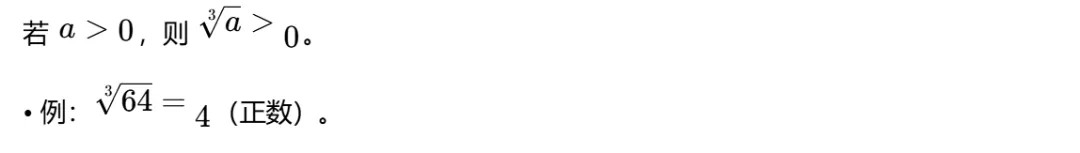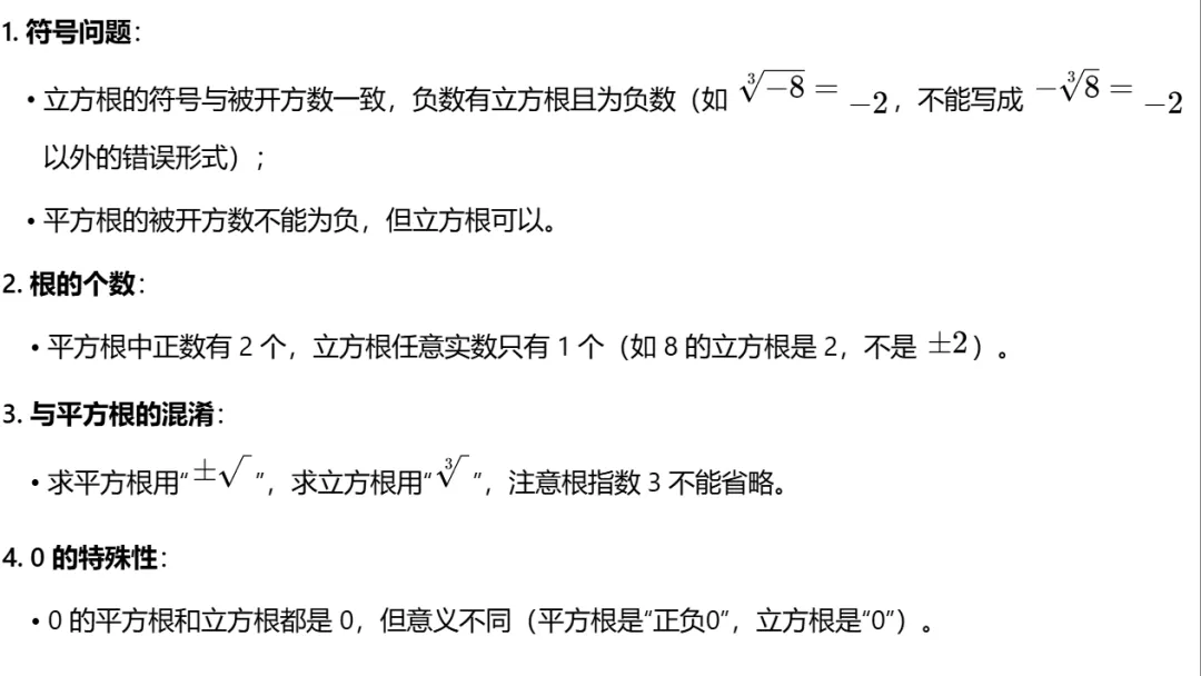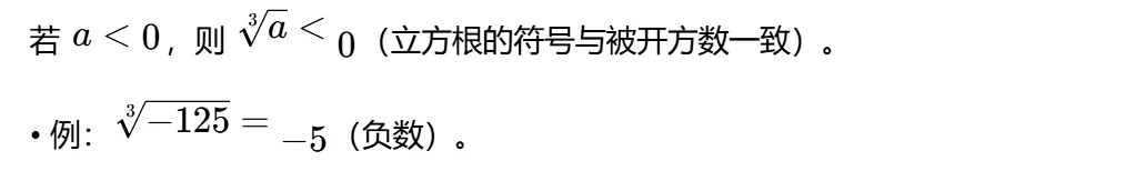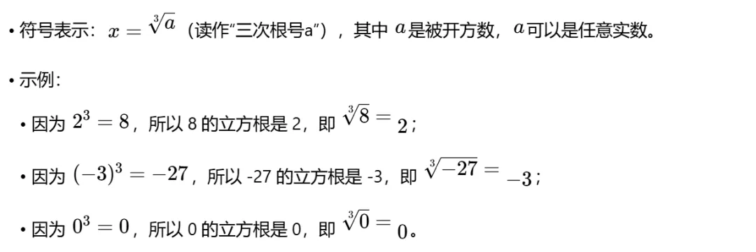 与平方根不同,任何实数(正数、负数、0)都只有一个立方根,且立方根与原数同号。