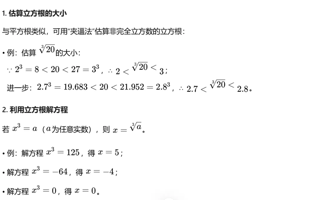 立方根:如果一个数 x的立方等于 a,即 x3=a,那么这个数 x叫做 a的立方根(也叫三次方根)。
