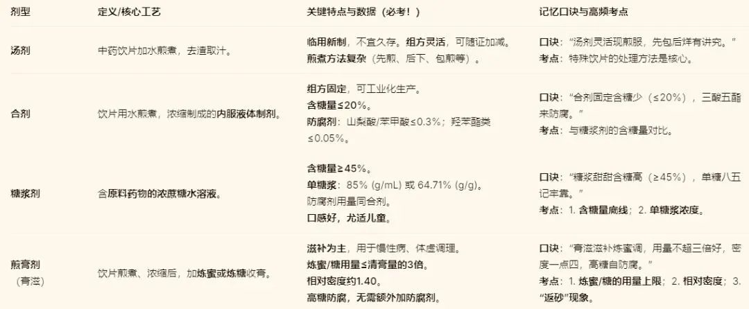 3.对比找区别:将易混剂型成对对比记忆,如:合剂 vs 糖浆剂(含糖量)、酒剂 vs 酊剂(溶剂、浓度)、流浸膏 vs 浸膏(浓度、形态)。