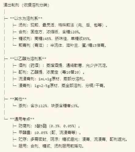 浸出制剂是中药从“饮片”到“成药”的桥梁。其分类核心是溶媒,不同溶媒决定了不同的提取成分、制剂特点和临床应用。