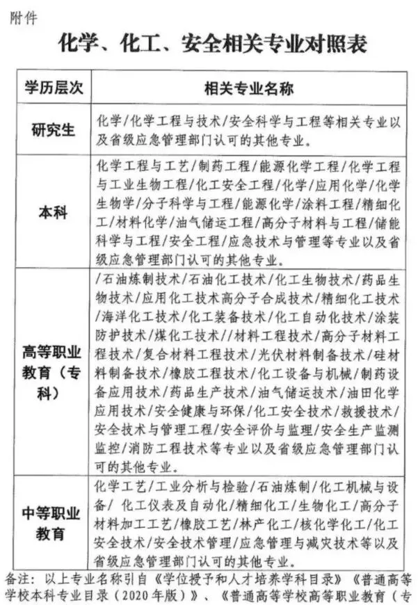 至此,第一个问题基本说清楚了,如果在各级应急部门发布的专业目录认定中均未发现你的专业,那你的专业也许真的就不对口“化学、化工、安全等相关专业”了哦。