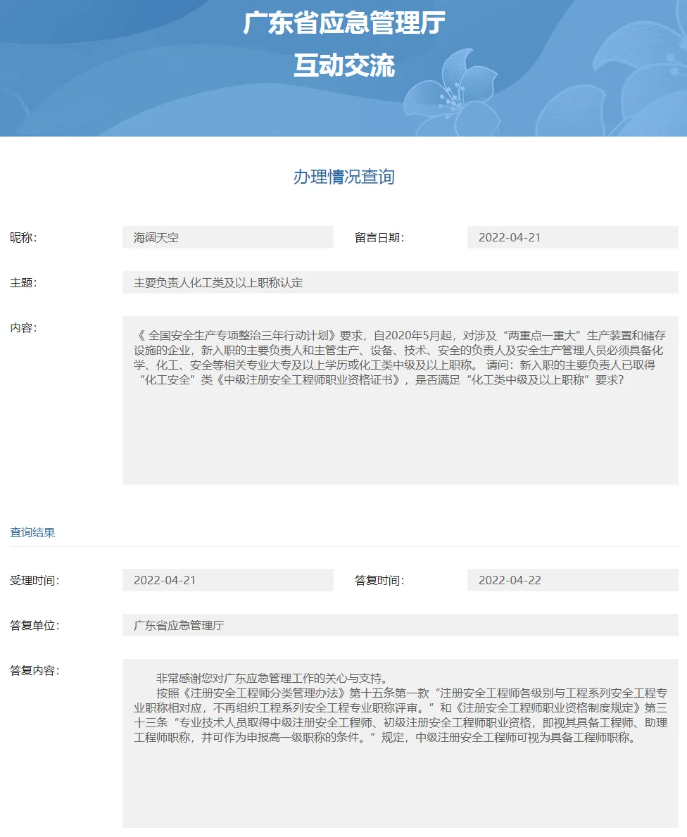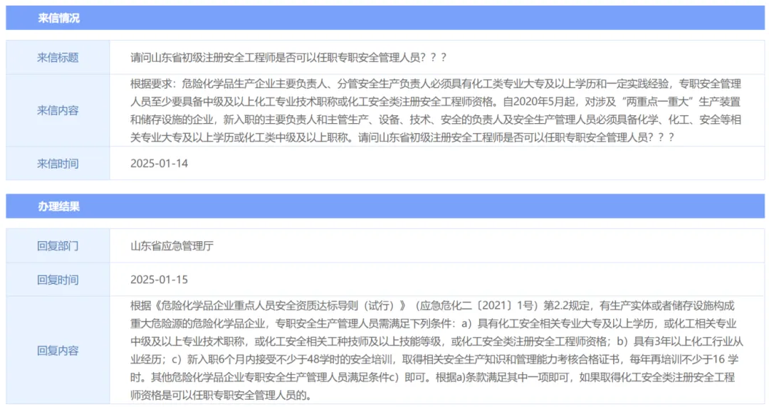 山东省回答还是很明确,回复时间也挺近。如果取得化工安全类注册安全工程师资格是可以任职专职安全管理人员的。其实这也是各省份陆续开展“初级注册安全工程师”考试的目的。