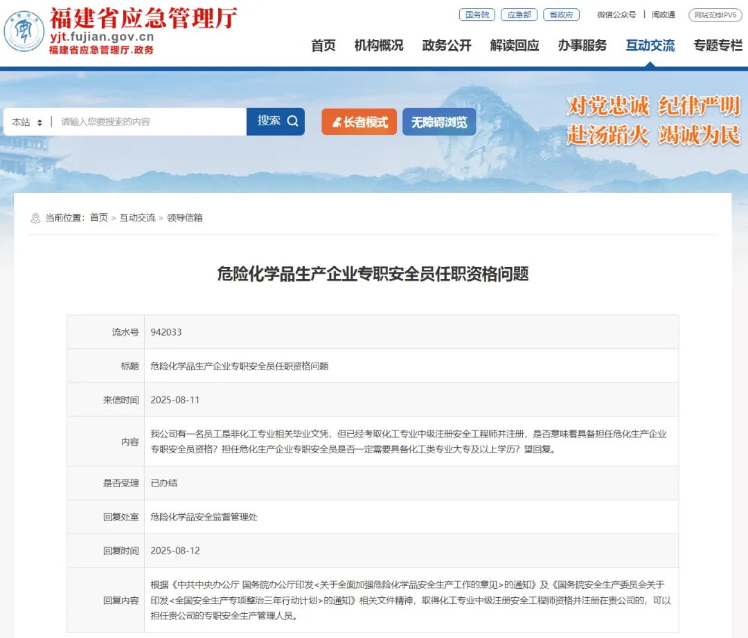 福建省回复的很直接,没得弯弯绕绕。根据相关文件精神,取得化工专业中级注册安全工程师资格并注册在贵公司的,可以担任贵公司的专职安全生产管理人员。