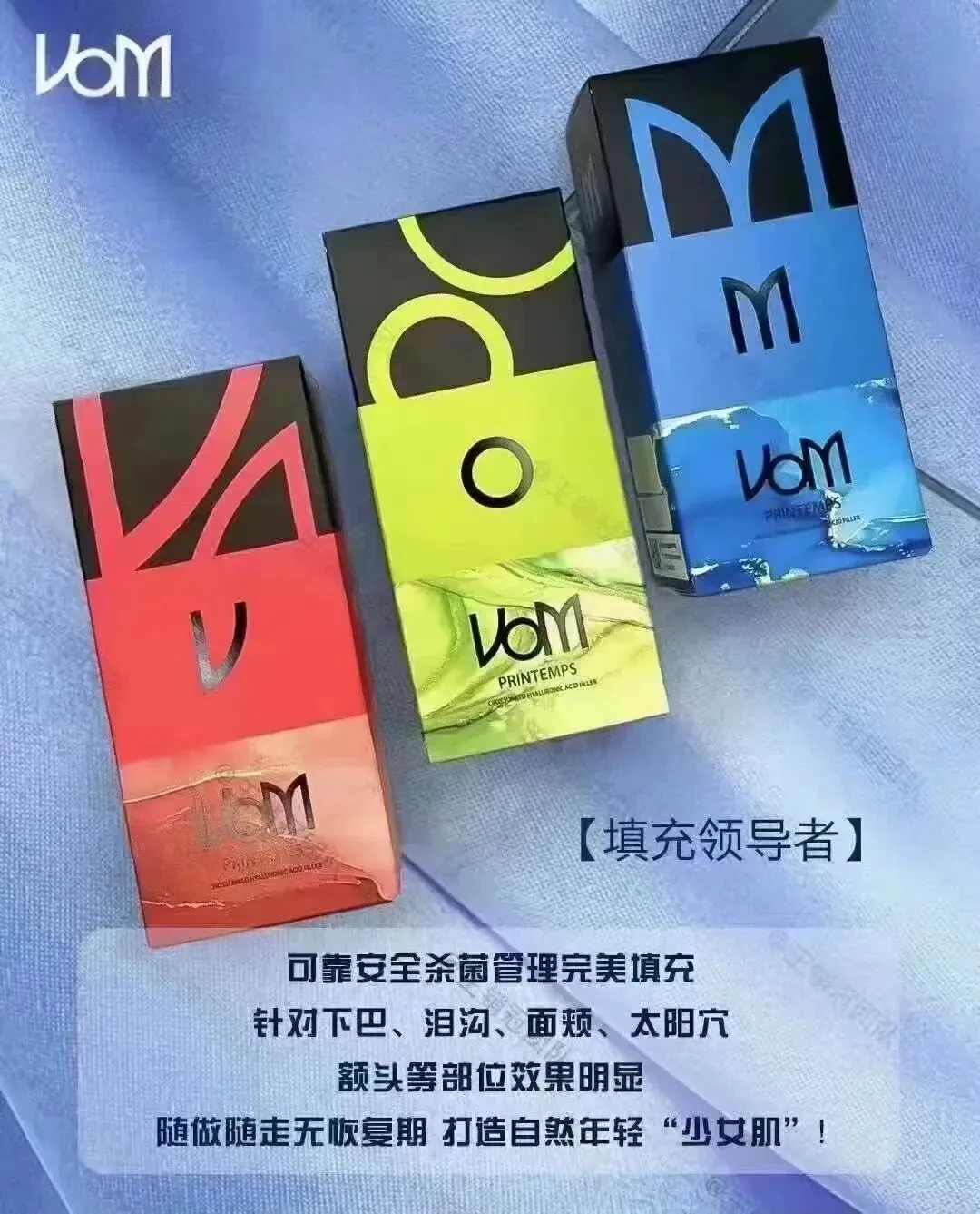 1) 韩国VOM春天玻尿酸采用,独特的“R Square”技术生产的“VOM”由颗粒形状中心具有强提升力的“双相”配方和外围的柔软“单相”配方组成。
