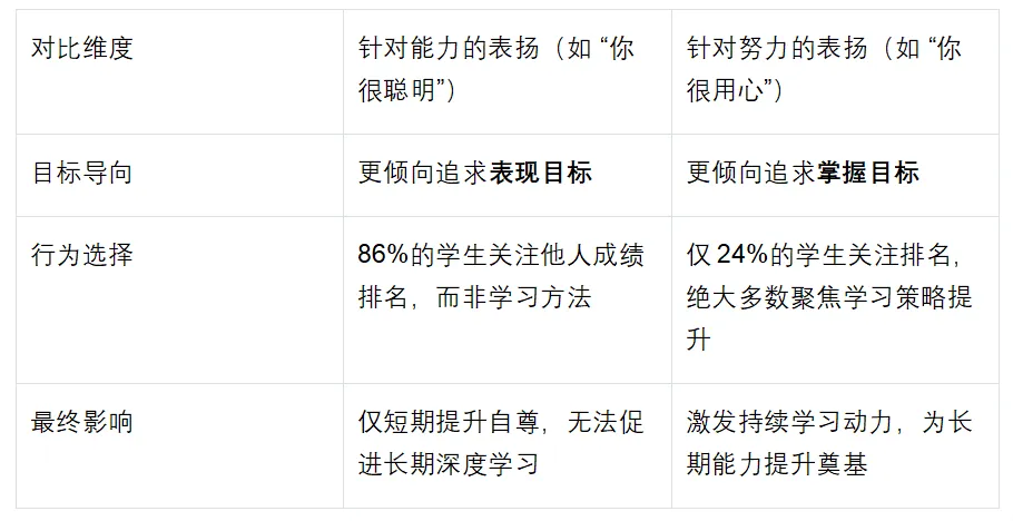 穆勒 (Mueller) 和德韦克 (Dweck) 1998 年的核心研究证实:不同类型的表扬会直接决定学生的成就目标导向,核心差异如下: