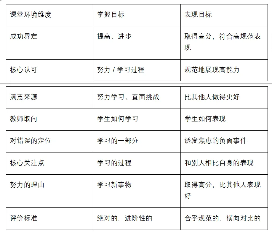 其中,掌握目标与表现目标的课堂环境核心差异如下表: