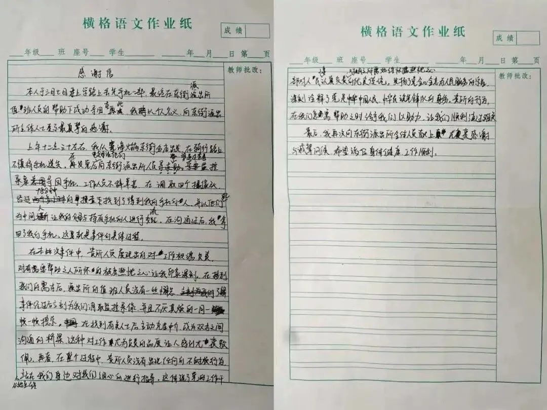 “这是孩子第一次真切感受到民警的帮助,叔叔们认真负责的态度,让他心里又温暖又感动。”3月18日,林妈妈带着儿子手写的感谢信和精心制作的锦旗来到派出所,笑着说道,“孩子特意交代我,一定要把这份感恩送到,这是他对警察叔叔最真诚的谢意。”