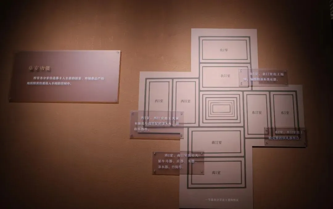 中原以龙为尊,楚国以凤为尊。中原墓葬头朝北脚朝南,楚国贵族的墓葬头朝东方。武王墩一号墓,其中东室-较完整的铜礼器组合;西室-大量木俑及与俑搭配的漆木车、剑和乐器;南室-大量车马器、兵器、玉器、漆木器、竹简等;北室-编钟、编磬和漆木类乐器。