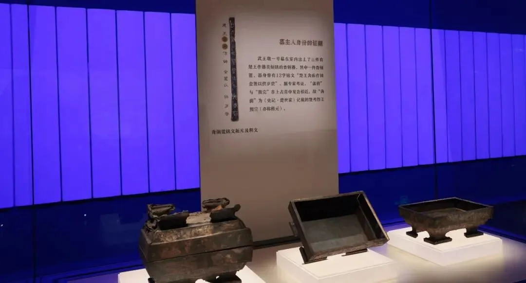 第二部分展览是对武王墩一号墓整体概述,以及确定墓主人为考烈王的证据说明。棺椁制度是周代丧葬礼制的重要组成部分,也是墓主身份等级的重要标尺。武王墩一号墓木椁室是考古工作首次发现结构完整,内涵丰富的九室多重棺椁,是战国时期王级棺椁分室制度的重要样本。综合墓葬规模,棺椁结构,出土器物风格与组合,青铜器铭文,人骨鉴定结果,历史文献等资料,确定武王墩一号墓墓主人为《史记。楚世家》记载的楚考烈王熊元。