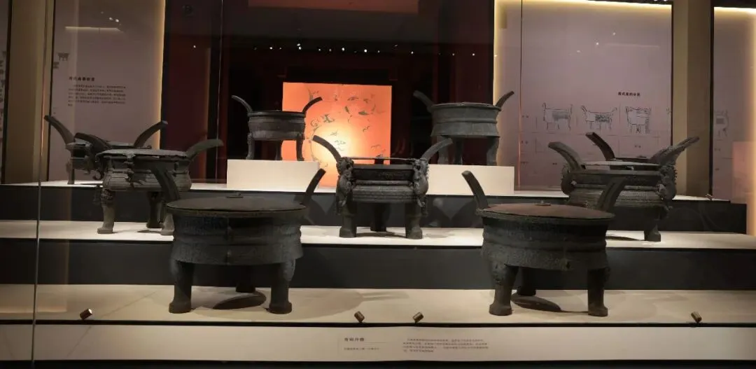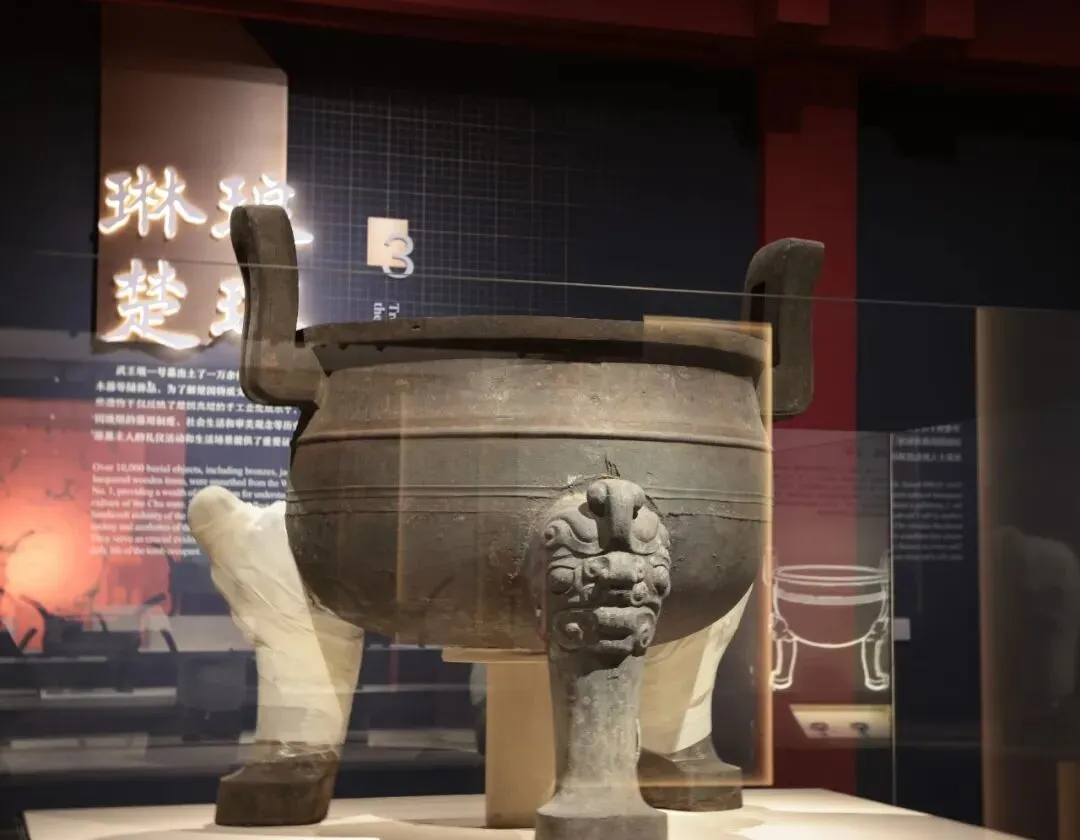 相邻展示的青铜九鼎,讲述着楚国对周礼的遵循,升鼎是盛装牲肉以供祭祀的食器皿,通常置于祭祀仪式的中心,被称为正鼎,是楚国王室和高级贵族的专用随葬品,是最能代表楚文化特征的器物之一。