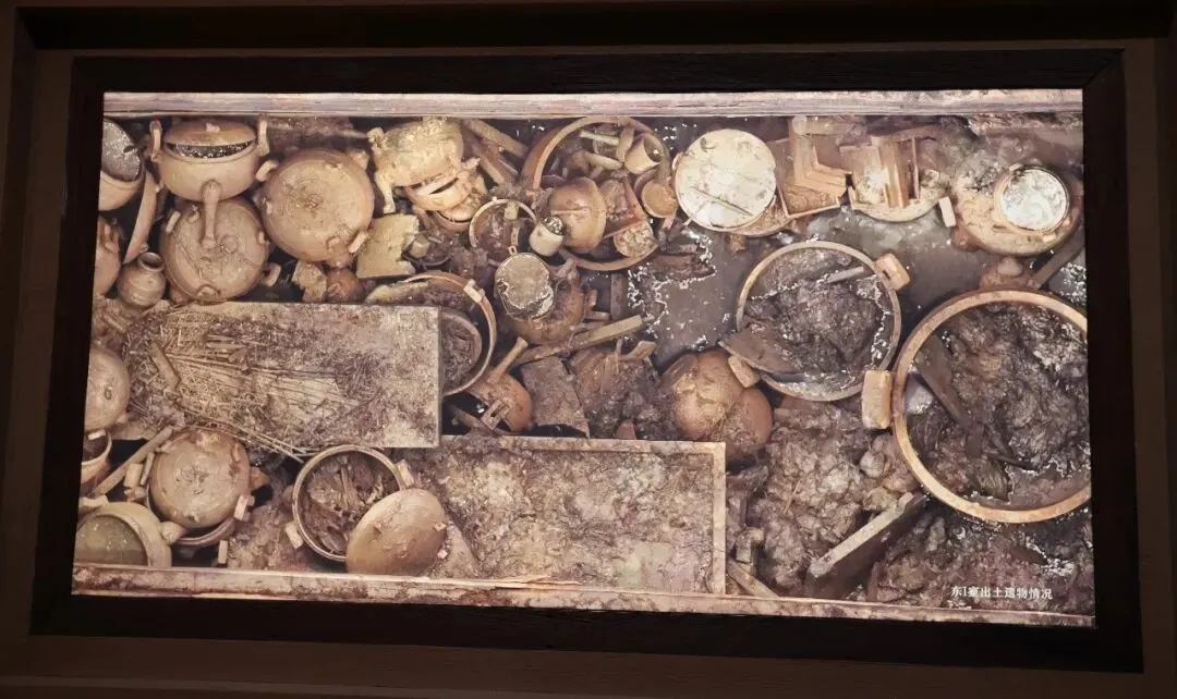 青铜器的墓室照片,最右侧大鼎就是此次打着绷带的楚大鼎,从照片仔细观察,每个容器盛着不同的菜肴,猜测是墓主人的挚爱美食吧。