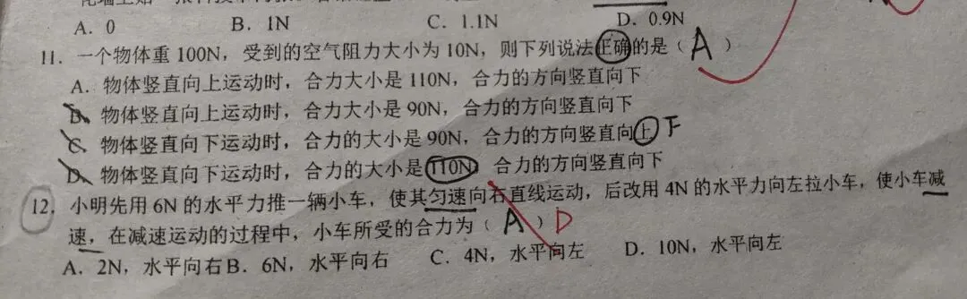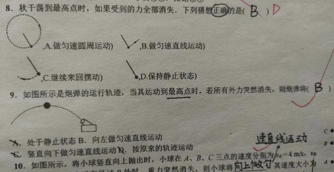 第8小题,当秋千荡到到最高点时,瞬间速度为零.若受到的力全部消失时,根据牛顿第一定律,秋千保持静止状态。