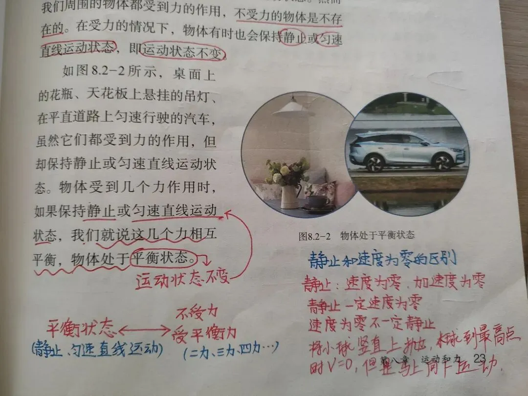 ①力不是维持运动的原因,而是改变物体运动状态的原因。例如:玩滑板车时,滑板车运动一段时间后会停下来,是因为受到了地面的摩擦力作用,摩擦力改变了它的运动状态,使其由运动变为静止。
