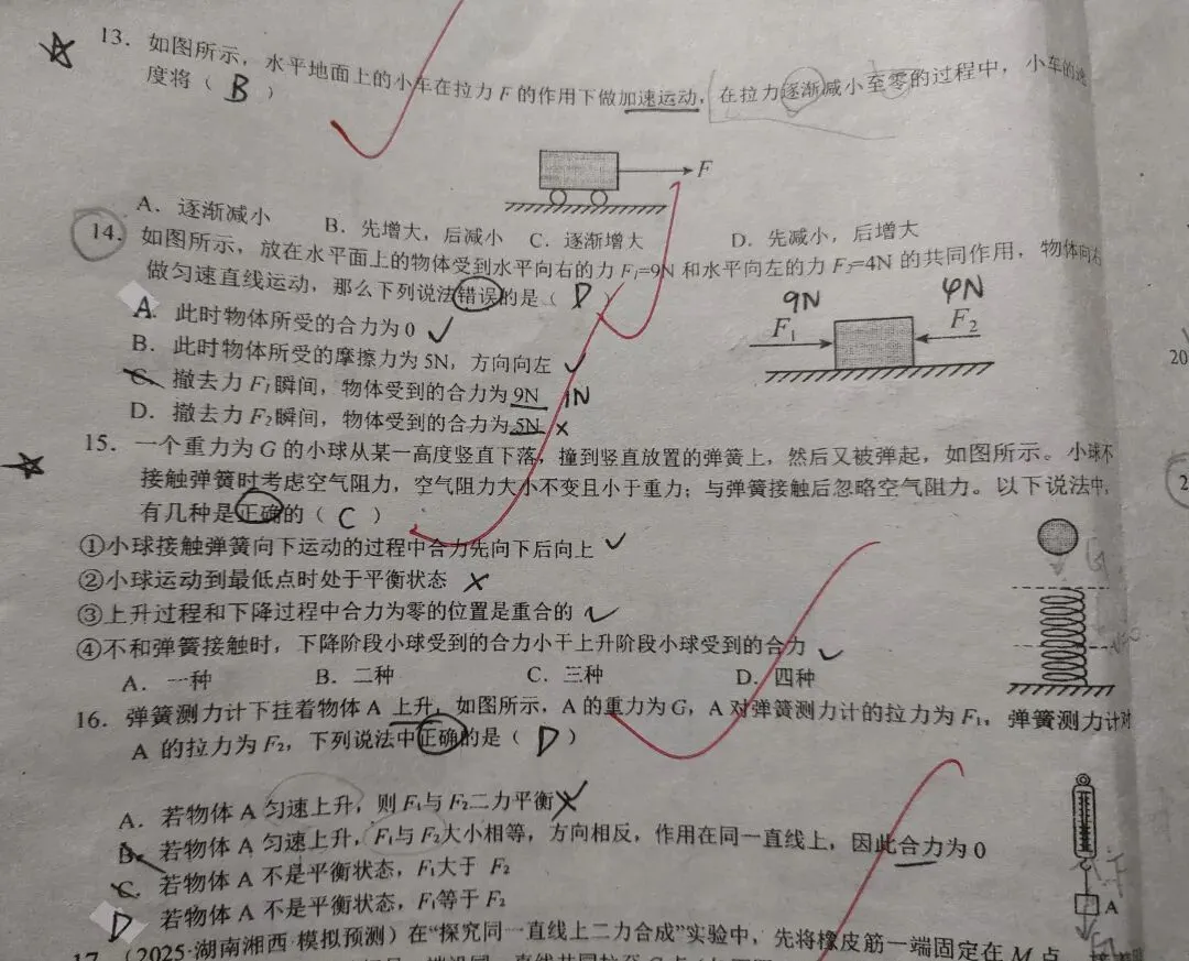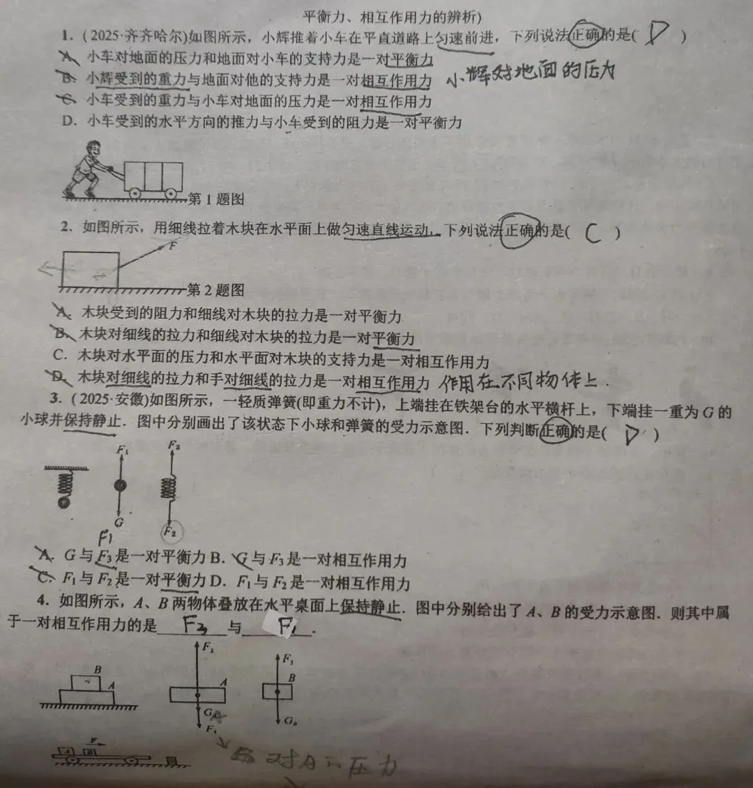 如上图第1小题中,小车对地面的压力和地面对小车的支持力是相互作用力;人受到的重力和地面对他的支持力一对平衡力。