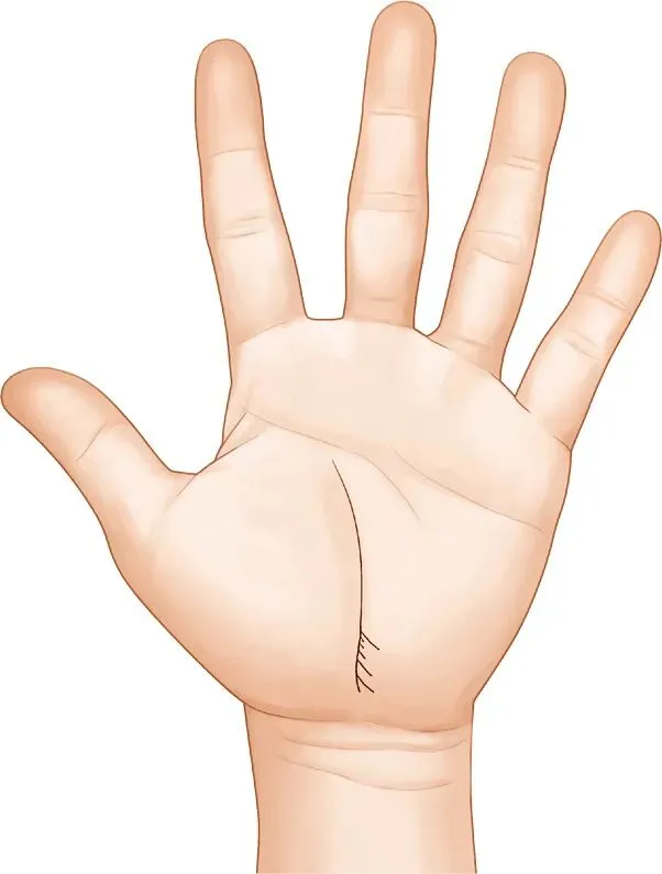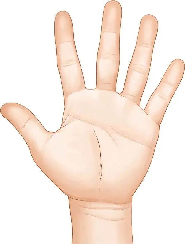 第五个特征就是在6区(大小鱼际之间)出现腕横纹缺失。