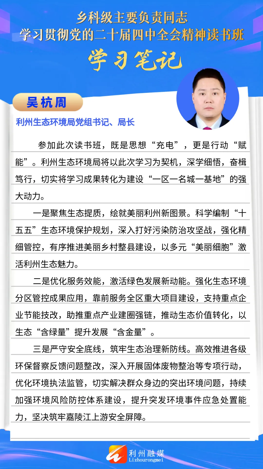 >读书班学习笔记丨利州生态环境局党组书记、局长吴杭周:以高质量环境品质助力“一区一名城一基地”建设