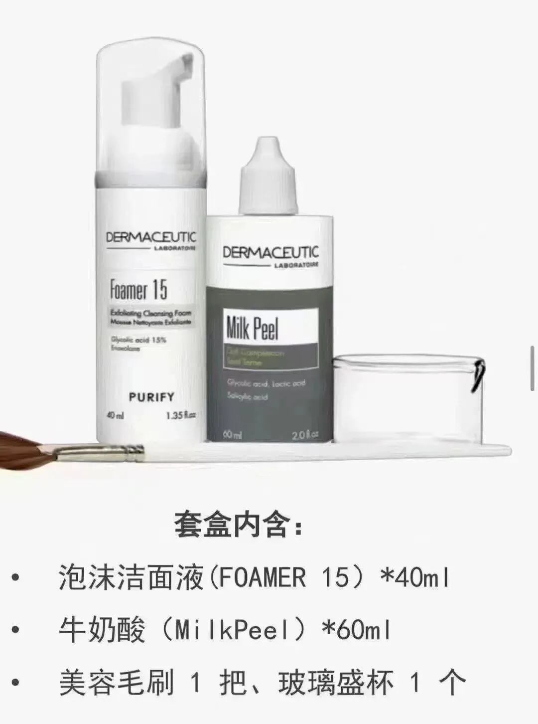 刷酸:将1.5ml 牛奶酸倒入杯子,美容刷从面部T区先开始涂抹,然后是下颌和嘴部,最后是两颊部位,鸡皮肤部位使用美容刷均匀涂抹。