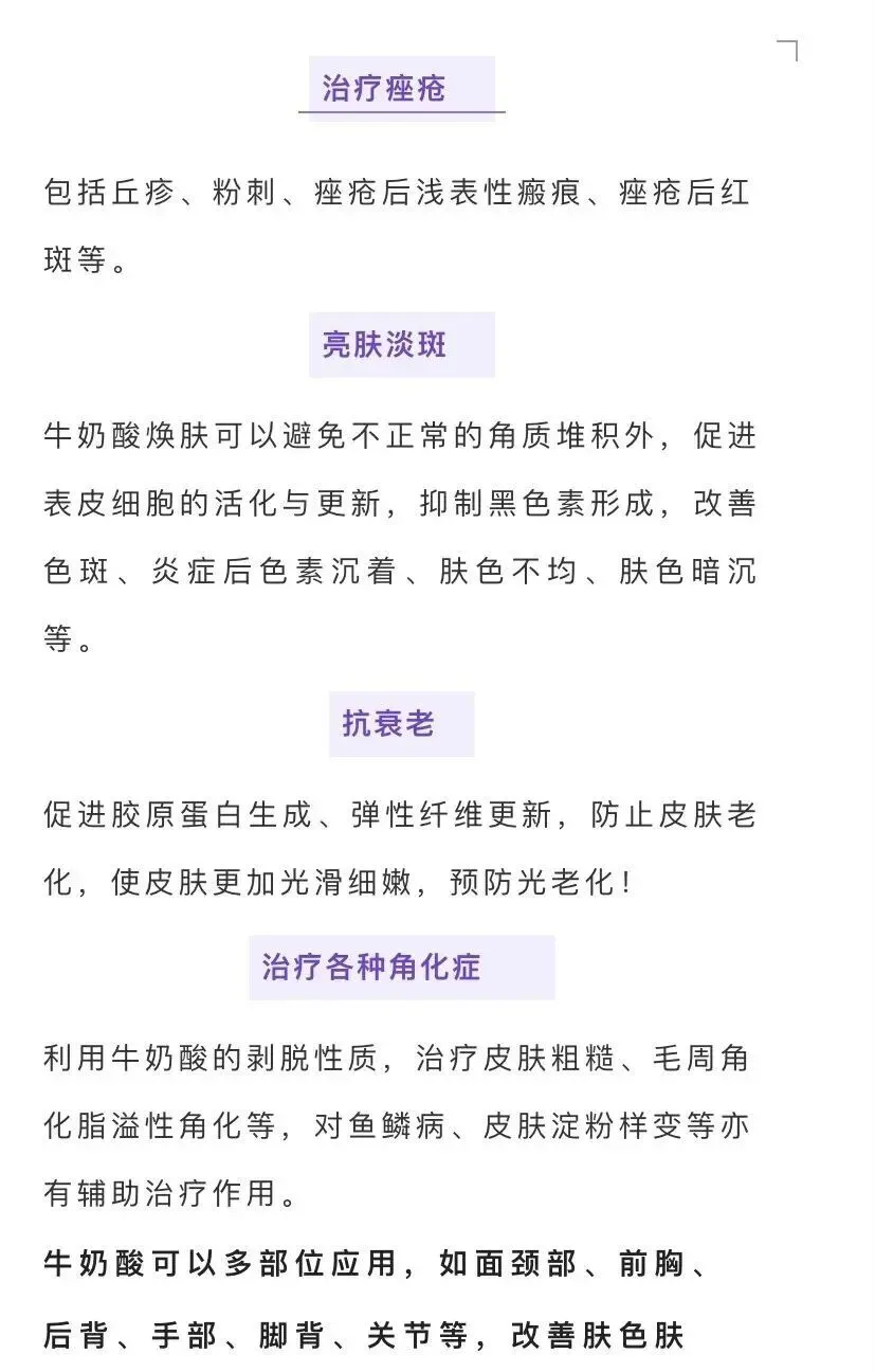 治疗各种角化症:李勇牛奶酸的剥脱性质,治疗皮肤粗糙、毛周角化脂溢性角化、对鱼鳞病、皮肤淀粉样变亦有辅助治疗作用