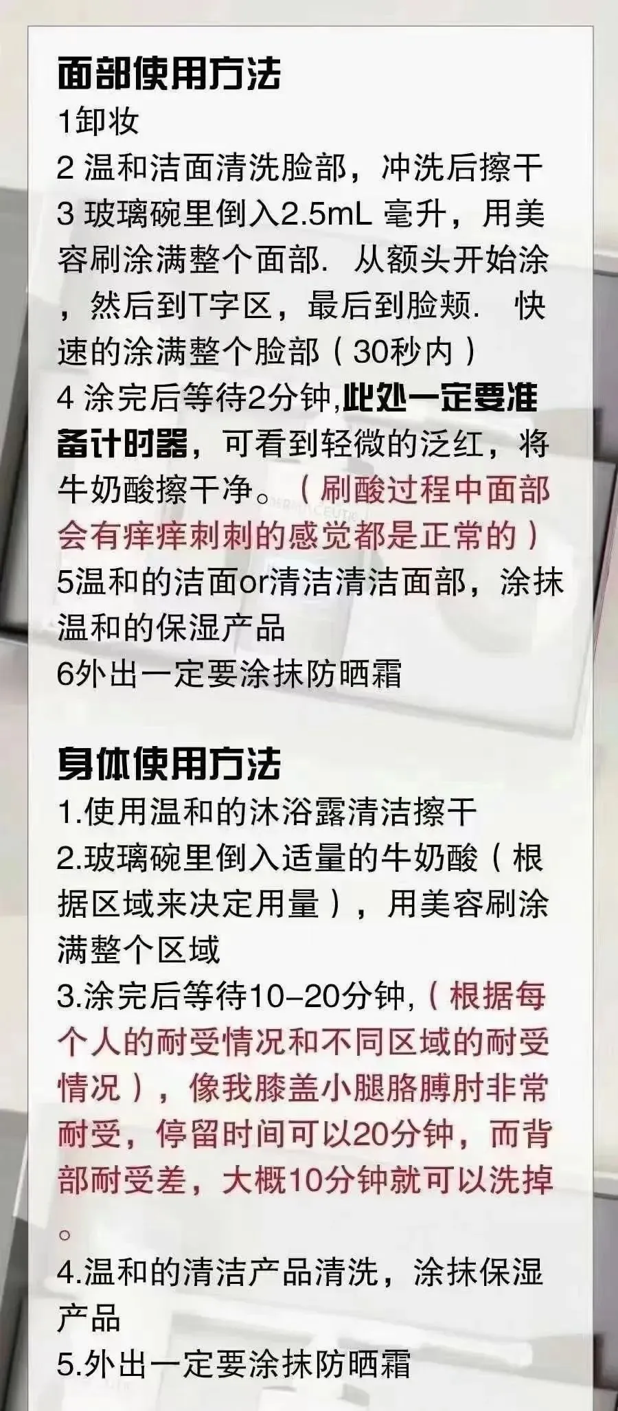 停留:停留2.5分钟后(身体鸡皮肤可最多可停留15分钟),可能出现轻微的红斑和中度泛红