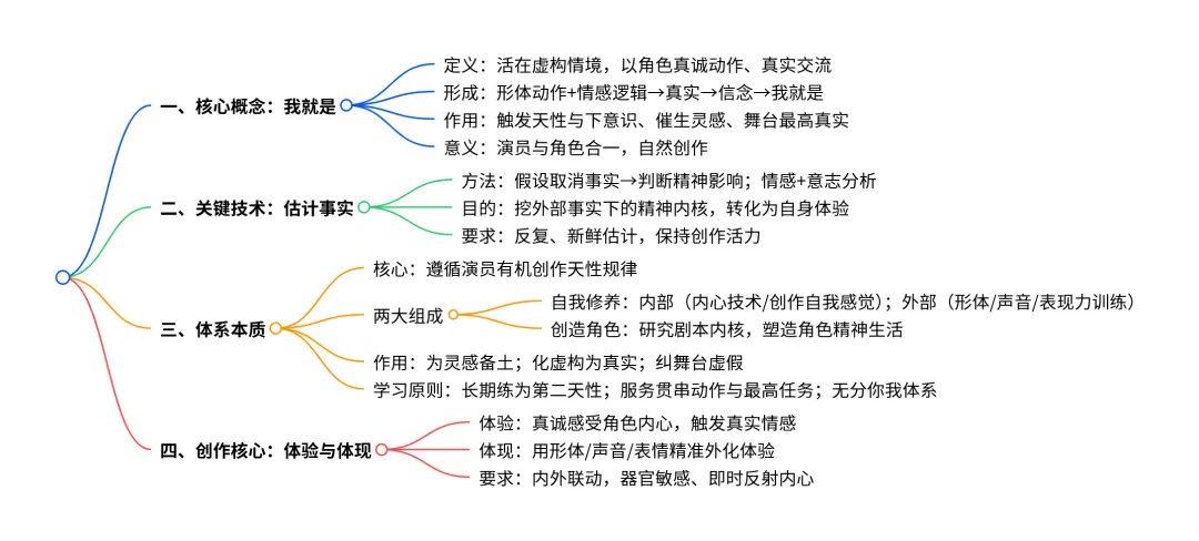 我的"体系"分为两个主要部分:1.演员内部的和外部的自我修养;2.演员内部的和外部的创造角色的工作。内部的自我修养在于锻炼内心技术,使演员能在自身唤起创作的自我感觉,因为在创作自我感觉的帮助下,灵感最容易降临到演员身上来。外部的自我修养在于使形体器官准备好去体现角色,并精确地把角色的内心生活表达出来。创造角色的工作在于研究戏剧作品的精神实质,研究该作品所由产生,并决定着该作品及其中每一个角色的意义的那一内核。(《全集》第1卷,478-479页)