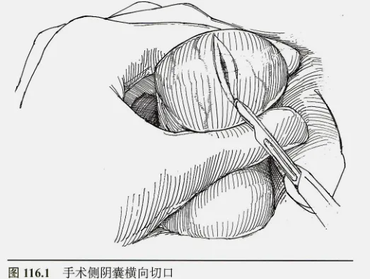 5.创面彻底止血后,以 3-0 号或4-0 号可吸收线间断缝合肉膜层。4-0可吸收线行间断外翻缝合或连续皮内缝合关闭阴囊皮缘。本次手术未放置皮片引流。必要时切口下方阴囊皮肤戳孔,放置皮片引流,术后24小时后拔除。