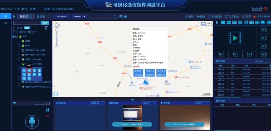 /dist/index.html:这是文件形式,dist意为发布目录,这通常意味着前端的代码已经编译打包完成,部署在了服务器上。主界面包括通讯录和调度组两大模块。通讯录展示调度机后台配置的部门以及成员,以树形展示通讯录树形结构中可以展示成员状态,通讯录树形结构中可以展示在线用户数、离线用户数(特殊应用场合中,可以只展示在线用户)。当鼠标悬浮至某成员时,将展示该成员所支持的全部功能,依次为:点对点语音通话、实时位置查看、视频监控、点对点视频双向通话、语音监听、轨迹回放、点对点多媒体消息、远程开始录像、远程结束录像及远程拍照。