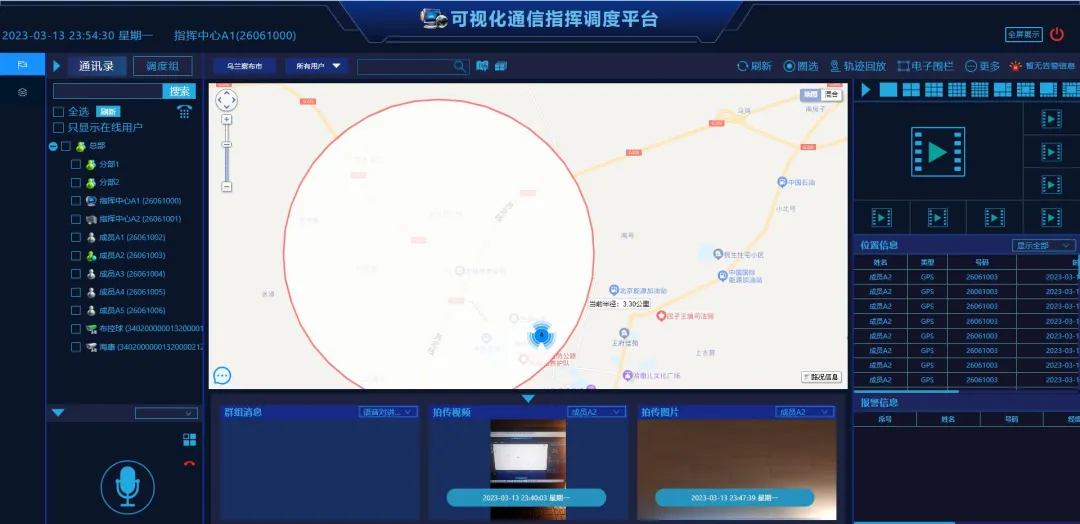 如现场遇到紧急情况,可以直接发起S0S报警,建立与WEB调度台的双向视频通话方便及时汇报现场信息到指挥中心报警消息模块里会显示该成员的实时位置