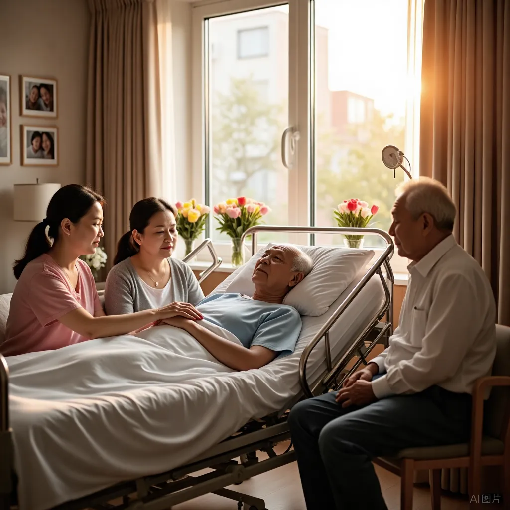 他的妻子亲吻他,他的儿子女儿也亲吻他。一家人紧紧靠在一起,沉醉在亲情里,在最深的爱里面。病人的脸上,痛苦好像轻了一些。
