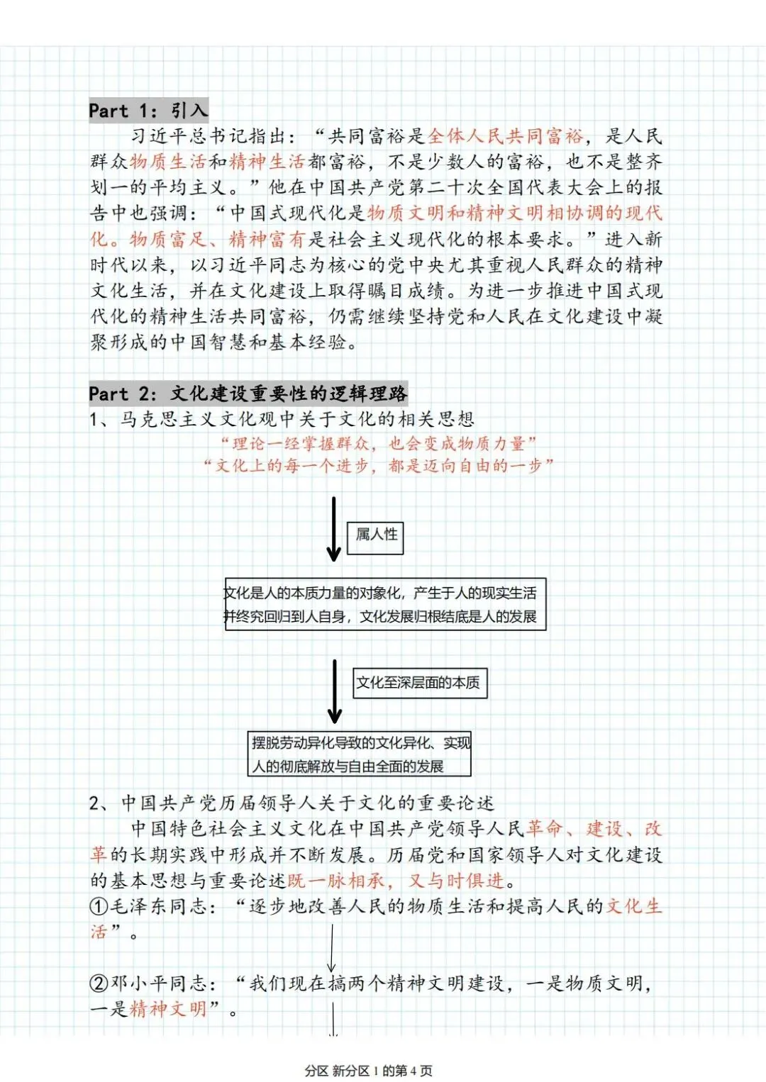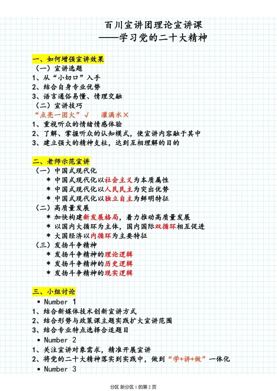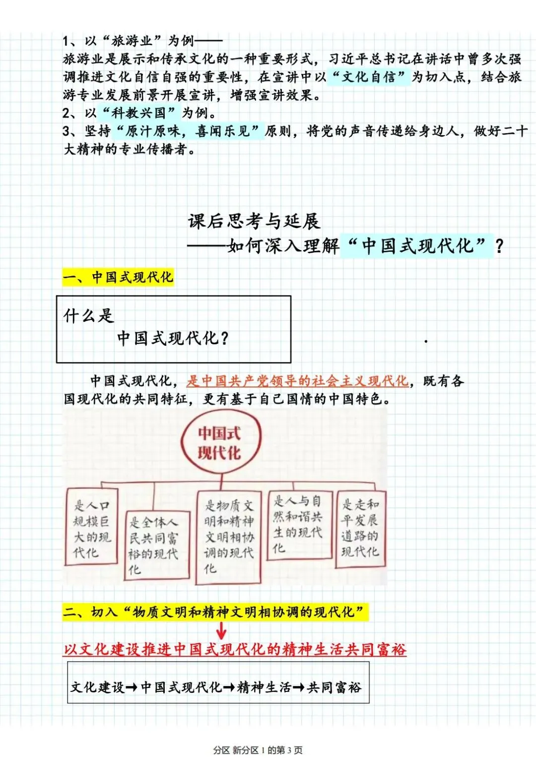 老师点评:张永香同学“百川宣讲团理论宣讲课——学习党的二十大精神”课程笔记,紧紧围绕“中国式现代化”的内涵和本质要求展开,着重对以文化建设推进中国式现代化的精神生活共同富裕进行阐述,具有鲜明的主题、思维导图环环紧扣,逻辑清晰、结构严密、理论联系实践,图表结合,特别是对理论内容有自己深刻的理解、认识和凝练总结,并且对关键词句有醒目的标注,有助于学深悟透党的二十大精神,更好地做到“学+讲+做”有机结合。