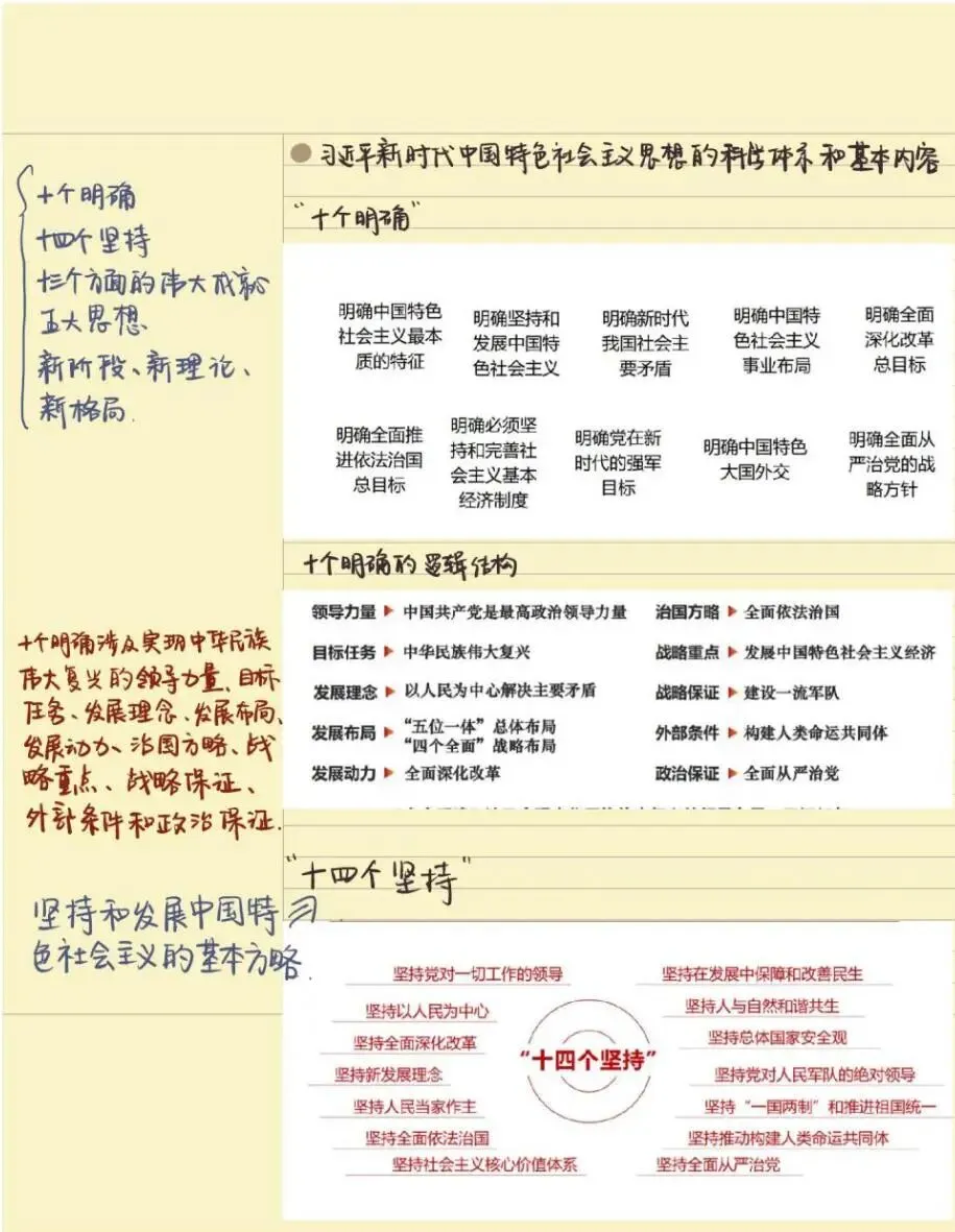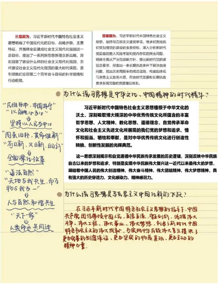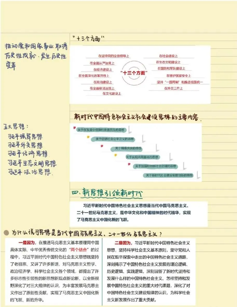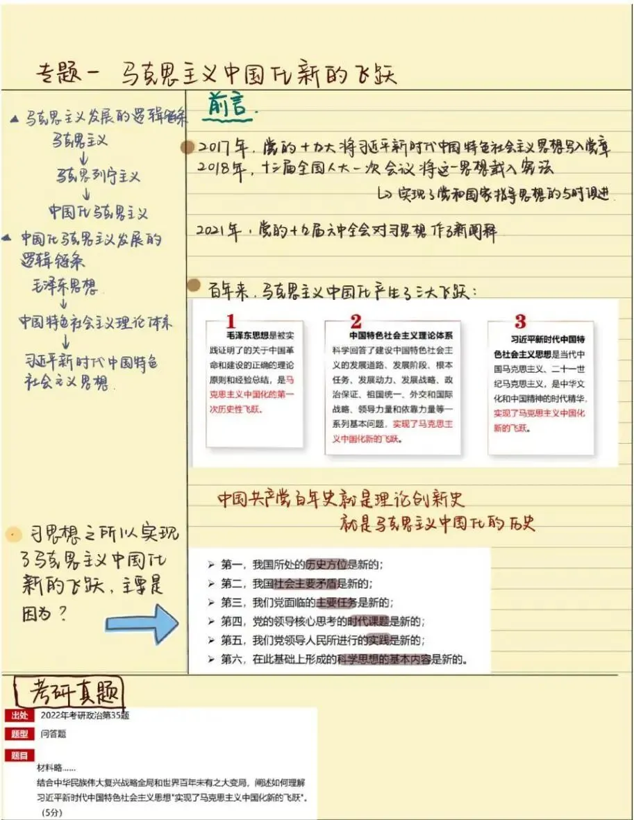 老师点评:解琳同学《习近平新时代中国特色社会主义思想概论》课程笔记,以康奈尔笔记法为主,结合时间线索笔记法、思维导图法等对“马克思主义中国化新的飞跃”内容进行了系统性的整理,具有鲜明的主题、思路清晰、结构严密、内容凝练,有适当的标注,版式设计合理。特别是对学习内容有自己的诸多思考、感悟和归纳总结,并且还结合知识点给出考研真题练习来巩固学习成效,在学习方法上有突破。