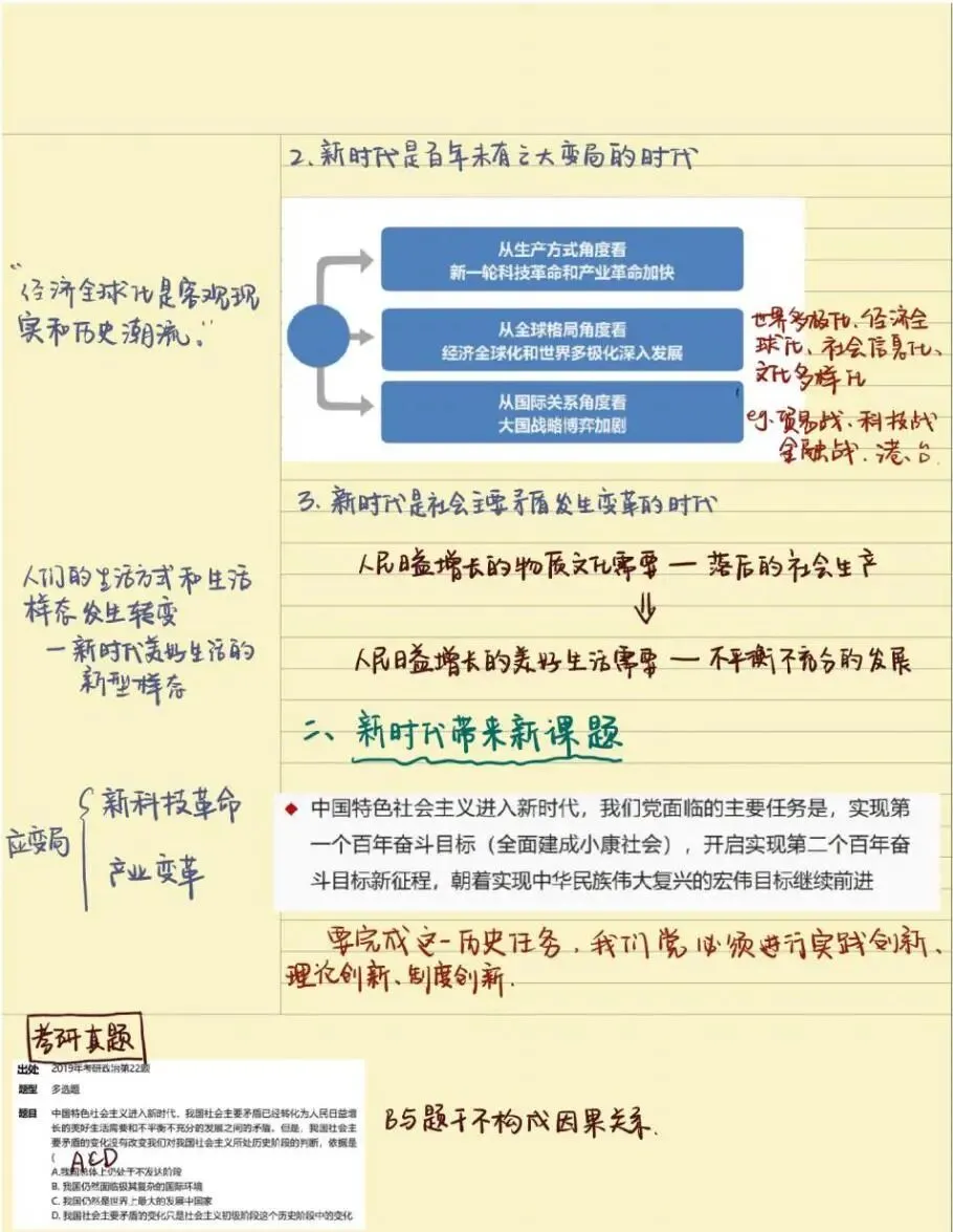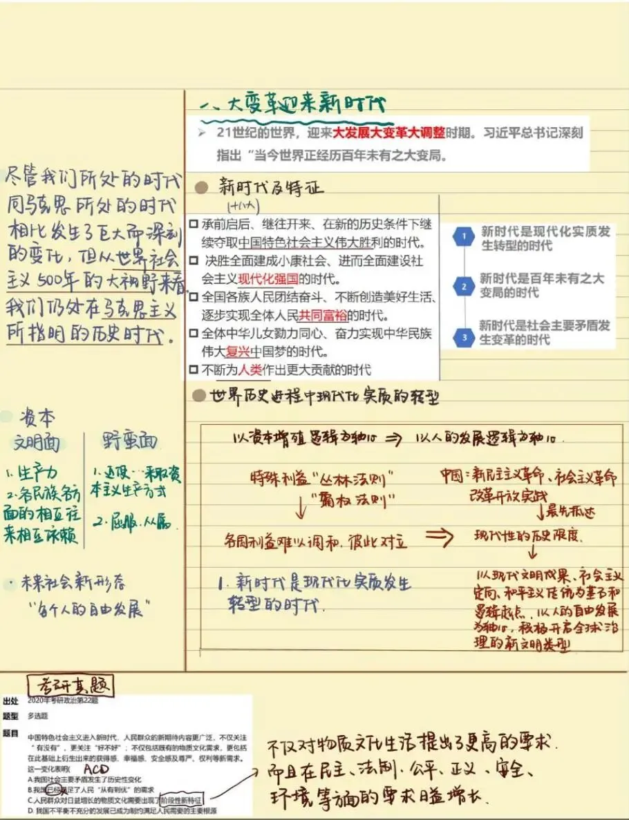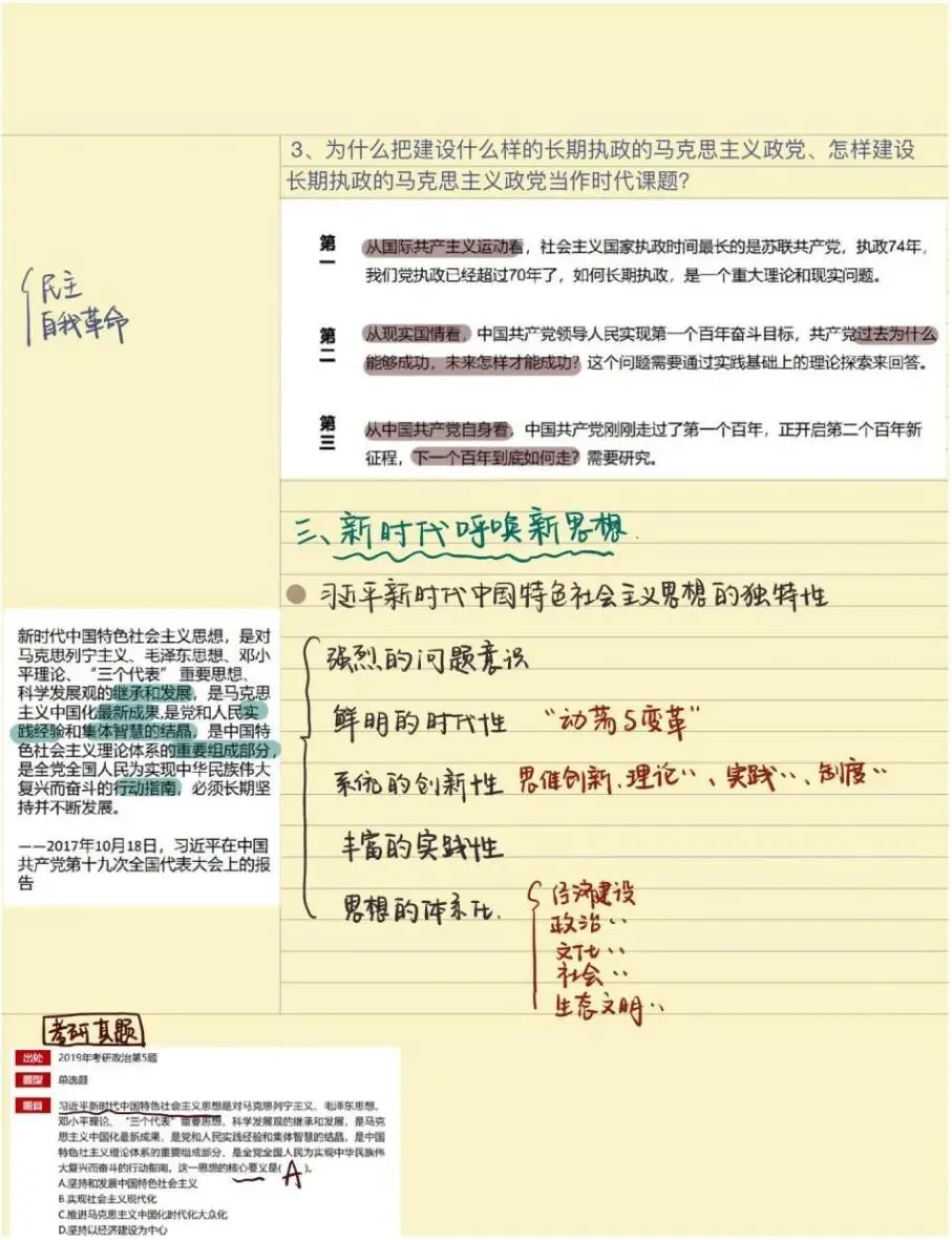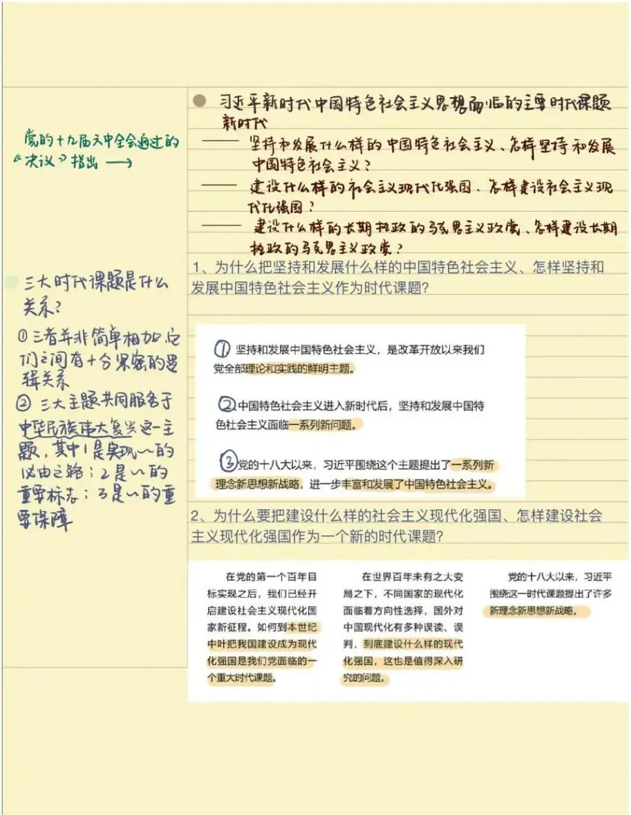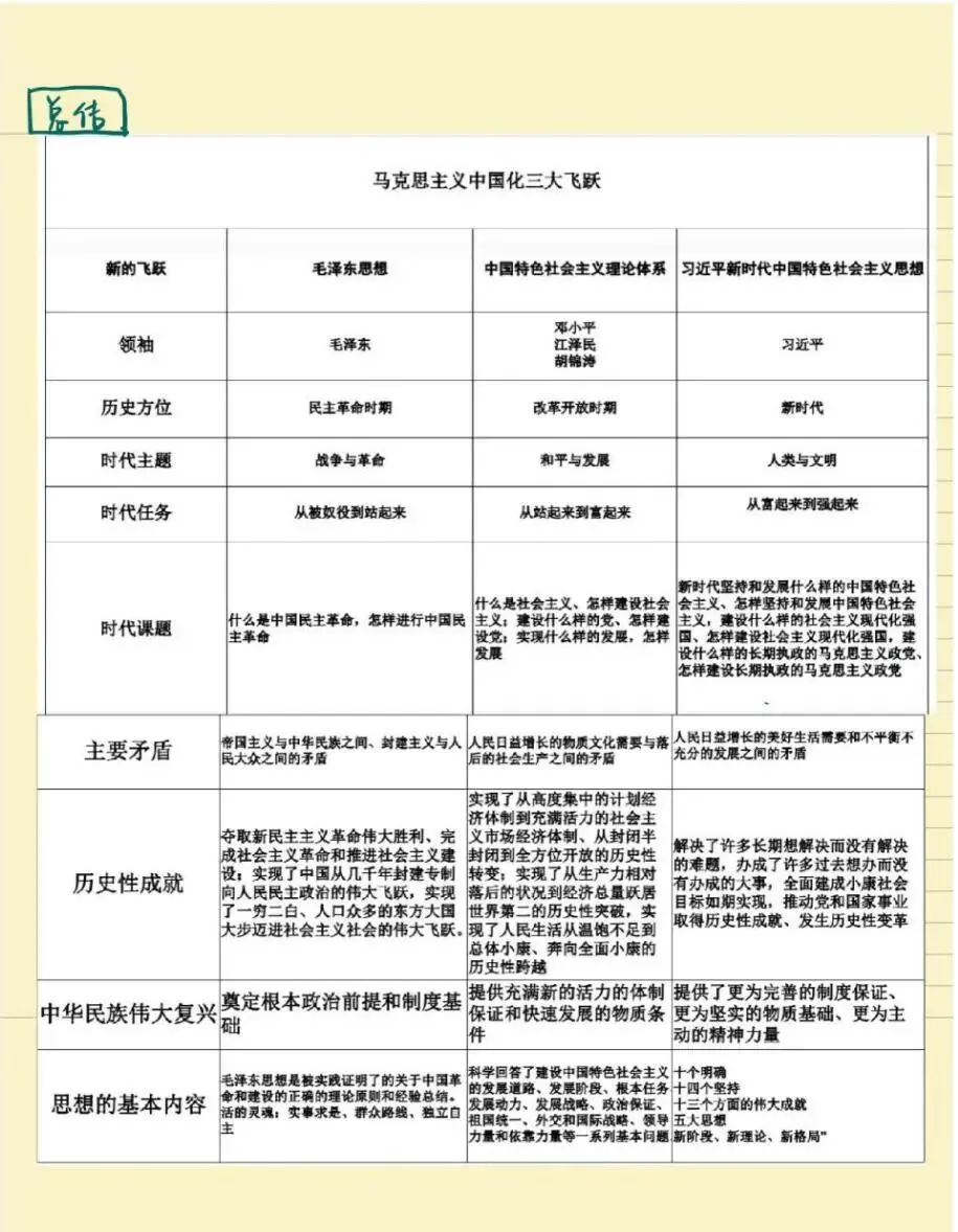 老师点评:解琳同学《习近平新时代中国特色社会主义思想概论》课程笔记,以康奈尔笔记法为主,结合时间线索笔记法、思维导图法等对“马克思主义中国化新的飞跃”内容进行了系统性的整理,具有鲜明的主题、思路清晰、结构严密、内容凝练,有适当的标注,版式设计合理。特别是对学习内容有自己的诸多思考、感悟和归纳总结,并且还结合知识点给出考研真题练习来巩固学习成效,在学习方法上有突破。