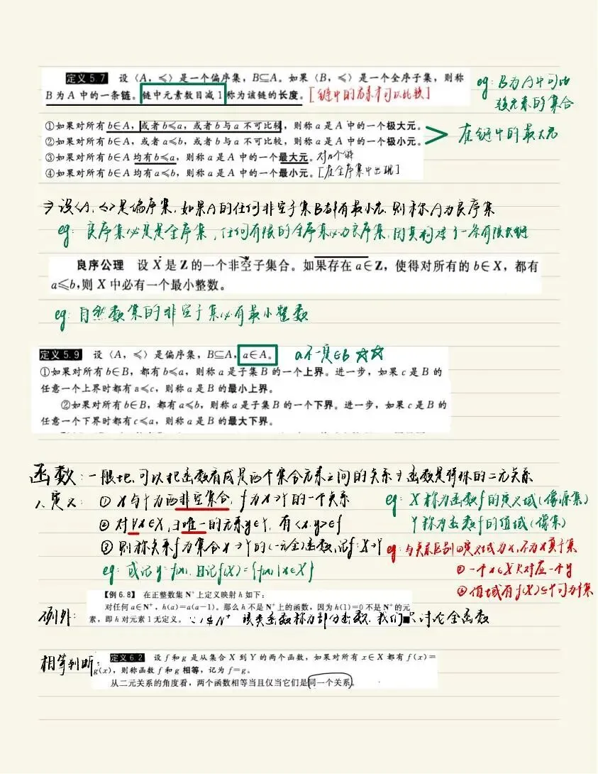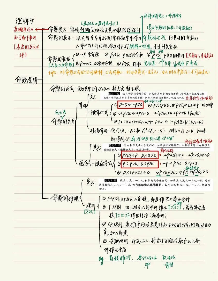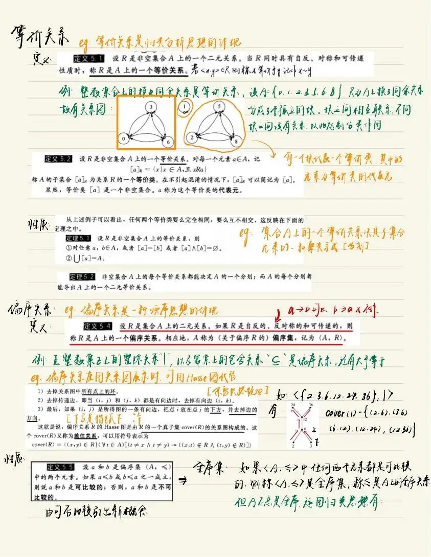 老师点评:周昊晨同学《离散数学》笔记形式整洁、内容明晰,很好地做到了“记录”与“整理”的结合。笔记对课程内容的知识点进行了系统化地组织,利用字色、标记等突出重点内容,通过示意图、例子等辅助阐述概念和性质,使用备注、标注等说明知识点的本质或容易出错的地方,这些都是值得借鉴的笔记方法。值得一提的是,这份笔记没有止步于“记录”,而是将自己对所学内容的思考结合到了笔记中,实现了对知识的系统整理,做到了“学而思”,值得推荐学习。