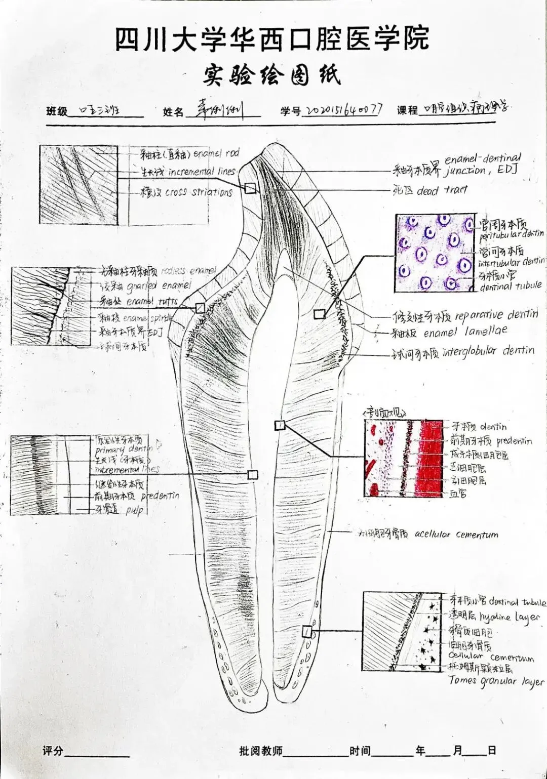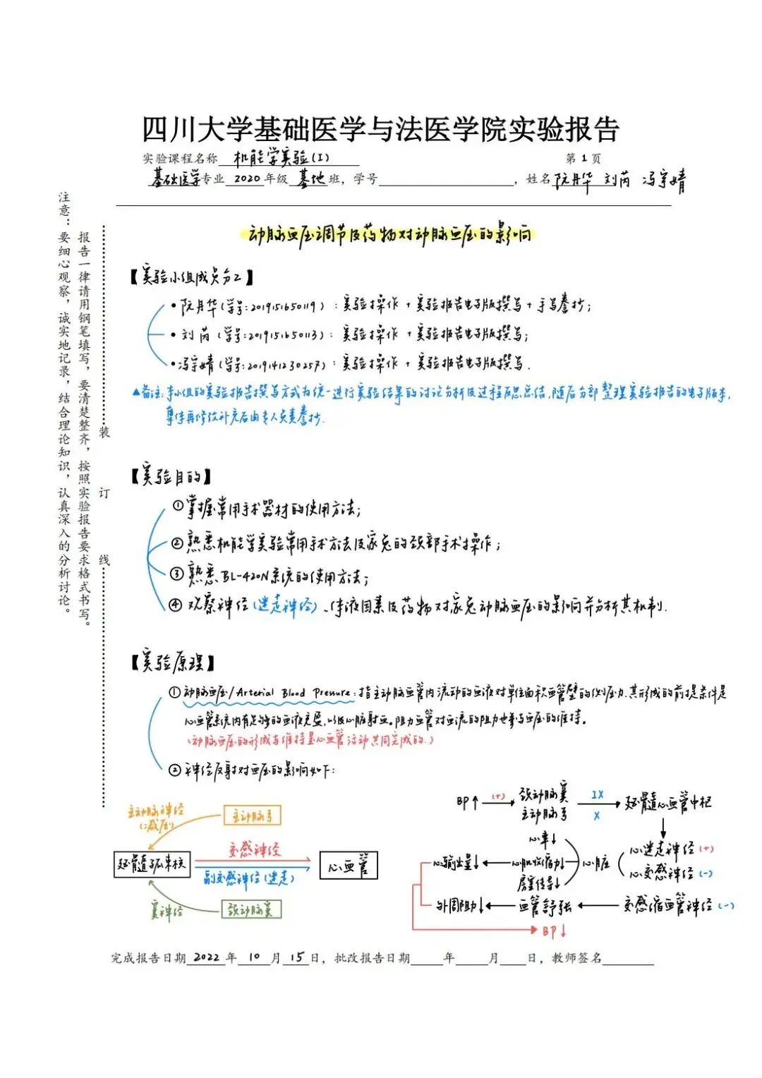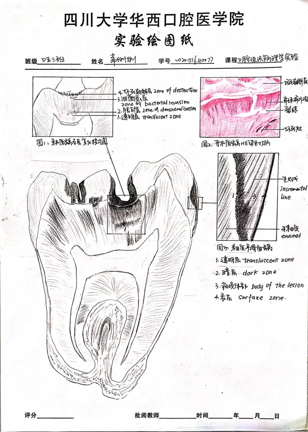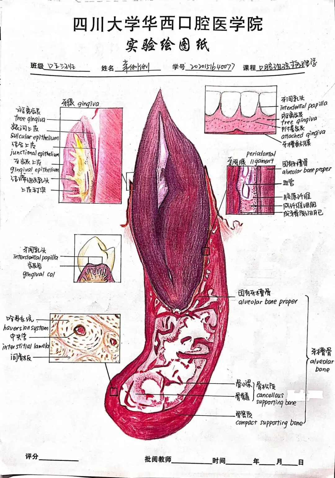 老师点评:阮丹华同学的《病理学》实验报告内容符合医学课程要求,字迹整洁,书法优美,图文并茂,绘图形象生动,列表总结重要知识点,标注重点英文词汇;技能学实验报告用不同颜色字迹标注说明实验操作要点,并绘制思维导图辅助梳理知识点联系及其医学机制,手绘与照片结合展示实验主要步骤,有效整理呈现实验结果和思考,版式设计美观合理,反映出严谨认真的学习态度和研究精神。