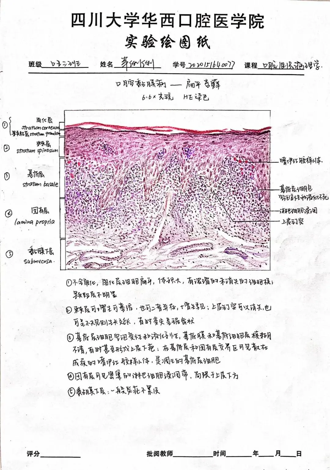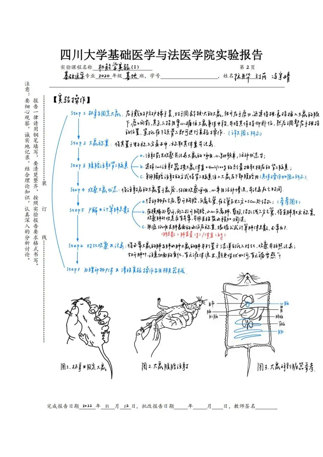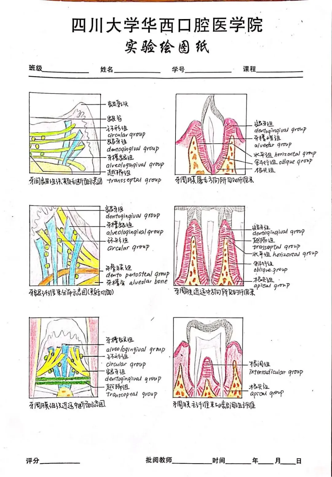 老师点评:阮丹华同学的《病理学》实验报告内容符合医学课程要求,字迹整洁,书法优美,图文并茂,绘图形象生动,列表总结重要知识点,标注重点英文词汇;技能学实验报告用不同颜色字迹标注说明实验操作要点,并绘制思维导图辅助梳理知识点联系及其医学机制,手绘与照片结合展示实验主要步骤,有效整理呈现实验结果和思考,版式设计美观合理,反映出严谨认真的学习态度和研究精神。