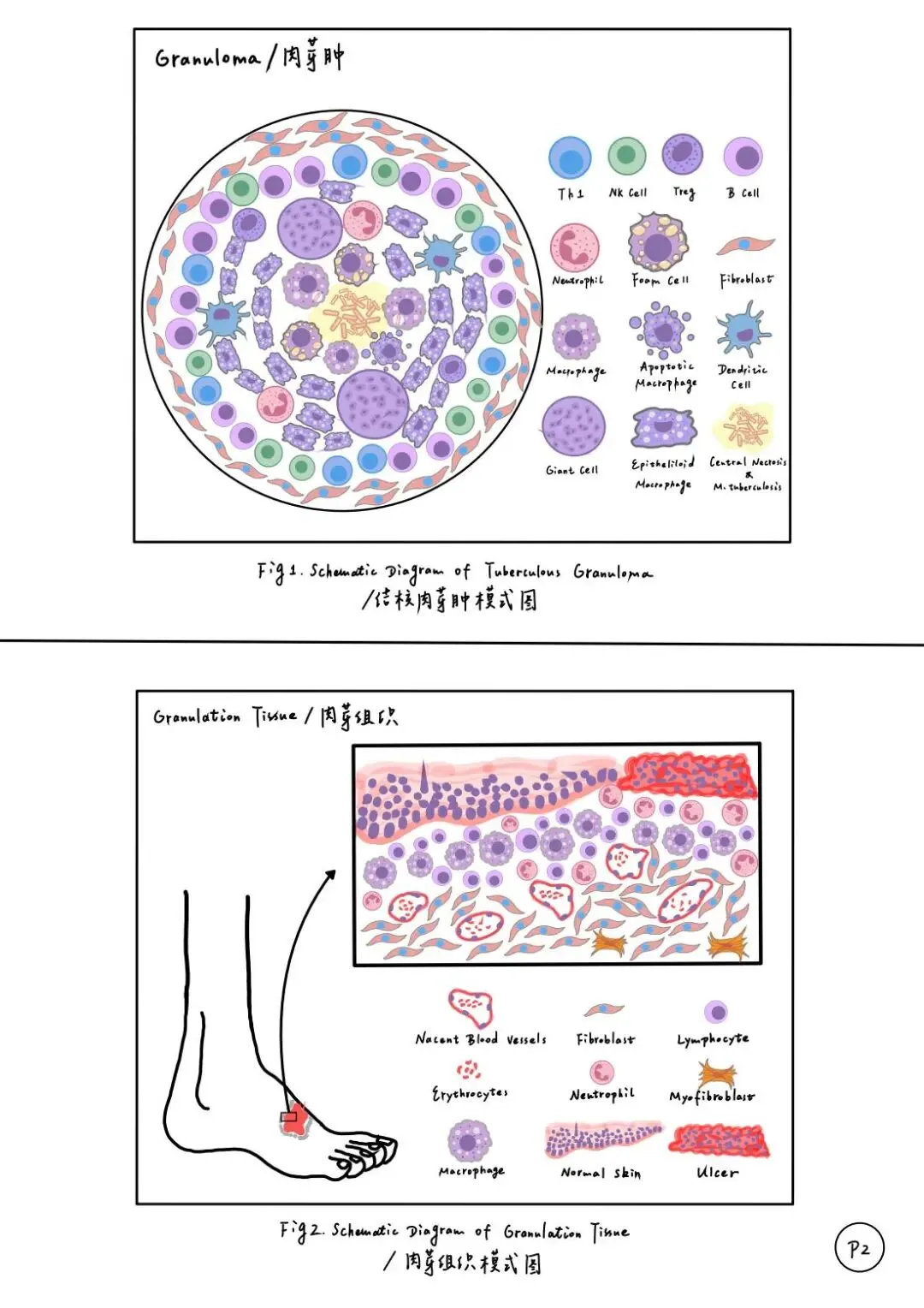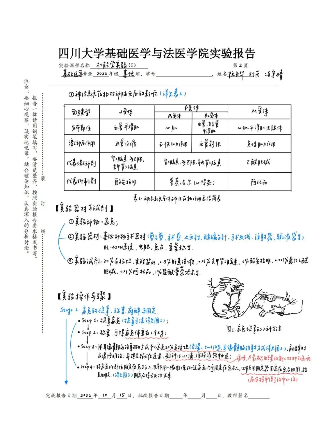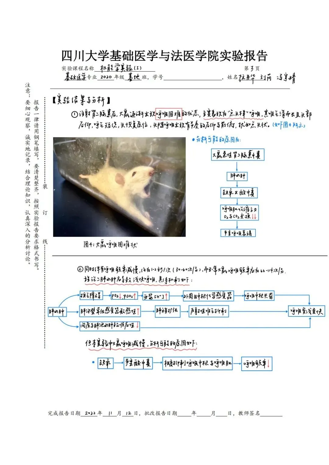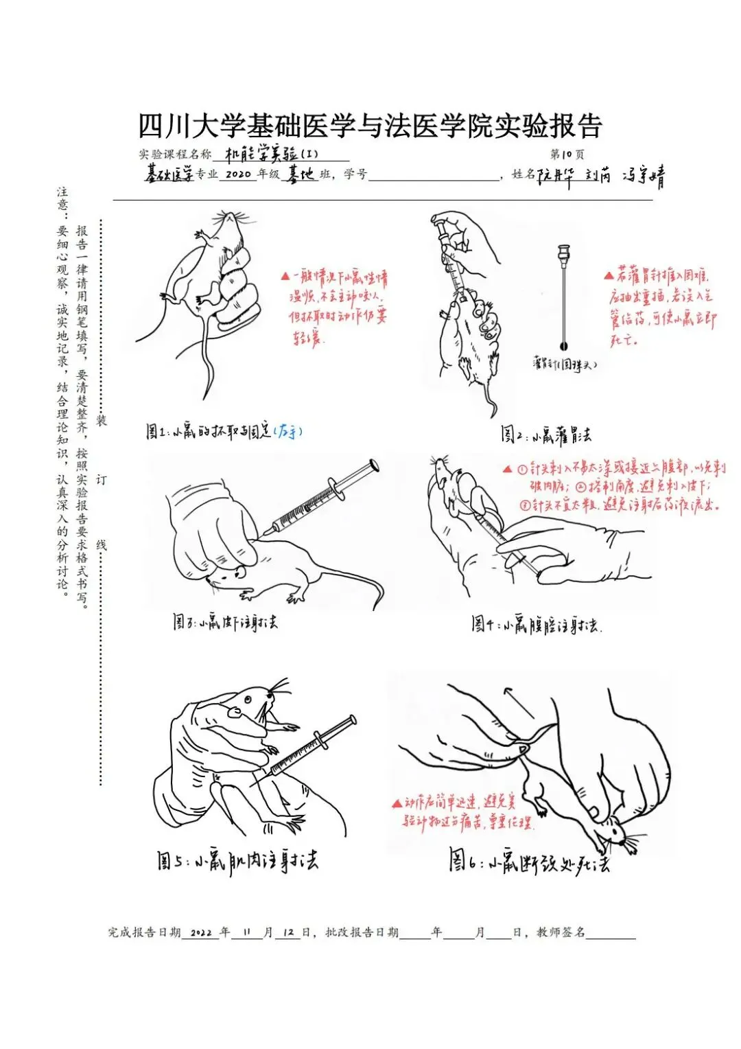 老师点评:阮丹华同学的《病理学》实验报告内容符合医学课程要求,字迹整洁,书法优美,图文并茂,绘图形象生动,列表总结重要知识点,标注重点英文词汇;技能学实验报告用不同颜色字迹标注说明实验操作要点,并绘制思维导图辅助梳理知识点联系及其医学机制,手绘与照片结合展示实验主要步骤,有效整理呈现实验结果和思考,版式设计美观合理,反映出严谨认真的学习态度和研究精神。