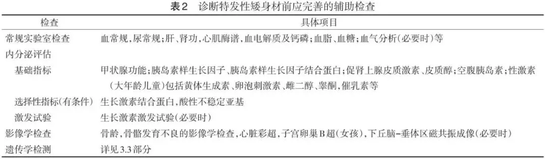 - 必查:严重矮小(身高<-3.0 SD)、非匀称性矮小或骨骼发育不良、可疑综合征性矮小(伴特殊面容、畸形、小头、智力落后)、家族性矮小、母亲反复不良孕产史。