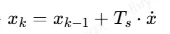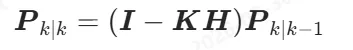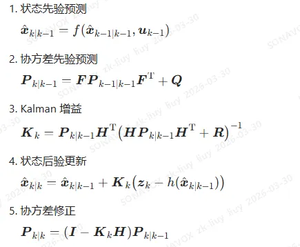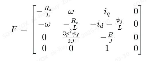 // 协方差矩阵 Pfloat P[4][4] = { {10,0,0,0}, {0,10,0,0}, {0,0,100,0}, {0,0,0,100}};// 过程噪声 Qfloat Q[4][4] = { {0.1f,0,0,0}, {0,0.1f,0,0}, {0,0,10.0f,0}, {0,0,0,0.5f}};// 观测噪声 R(电流采样噪声)float R[2][2] = { {0.5f,0}, {0,0.5f}};// 单位矩阵float I[4][4] = { {1,0,0,0}, {0,1,0,0}, {0,0,1,0}, {0,0,0,1}};//========================= 矩阵工具函数(简化版) =========================//void Matrix_Mul4x4(float A[4][4], float B[4][4], float out[4][4]);void Matrix_Mul4x4T(float A[4][4], float B[4][4], float out[4][4]); // A*B^Tvoid Matrix_Add4x4(float A[4][4], float B[4][4], float out[4][4]);float Matrix_Det2x2(float m[2][2]);void Matrix_Inv2x2(float m[2][2], float out[2][2]);//========================= EKF 主函数(5大步骤完整实现) =========================//// 输入:uα, uβ 电机电压// 输入:iα_sam, iβ_sam 电流采样void EKF_Step(float uα, float uβ, float iα_sam, float iβ_sam){ // 保存上一时刻状态 float iα_prev = x[0]; float iβ_prev = x[1]; float ωe_prev = x[2]; float θe_prev = x[3]; //===================================================================== // 【第一步:状态预测(先验估计)】 // 公式:x_pred = f(x_prev, u) // 完全使用电机 αβ 方程计算 //===================================================================== float x_pred[4]; x_pred[0] = iα_prev + Ts*(-Rs/Ls*iα_prev + ωe_prev*PSIf/Ls*sinf(θe_prev) + uα/Ls); x_pred[1] = iβ_prev + Ts*(-Rs/Ls*iβ_prev - ωe_prev*PSIf/Ls*cosf(θe_prev) + uβ/Ls); x_pred[2] = ωe_prev; // 短时间转速不变 x_pred[3] = θe_prev + Ts*ωe_prev; // 角度 = 角度 + 转速*时间 // 角度限幅 -π ~ π if(x_pred[3] > M_PI) x_pred[3] -= 2*M_PI; if(x_pred[3] < -M_PI) x_pred[3] += 2*M_PI; //===================================================================== // 【第二步:计算雅可比矩阵 F】 // 作用:非线性模型线性化,描述状态间误差耦合 //===================================================================== float F[4][4] = {0}; float F11 = 1 - Rs*Ts/Ls; float F13 = PSIf*Ts/Ls*sinf(θe_prev); float F14 = PSIf*Ts/Ls*ωe_prev*cosf(θe_prev); float F22 = 1 - Rs*Ts/Ls; float F23 = -PSIf*Ts/Ls*cosf(θe_prev); float F24 = PSIf*Ts/Ls*ωe_prev*sinf(θe_prev); F[0][0] = F11; F[0][1] = 0; F[0][2] = F13; F[0][3] = F14; F[1][0] = 0; F[1][1] = F22; F[1][2] = F23; F[1][3] = F24; F[2][0] = 0; F[2][1] = 0; F[2][2] = 1; F[2][3] = 0; F[3][0] = 0; F[3][1] = 0; F[3][2] = Ts; F[3][3] = 1; //===================================================================== // 【第三步:协方差预测】 // 公式:P_pred = F*P*F.T + Q // 作用:把上一轮误差按电机模型传播放大 //===================================================================== float P_temp1[4][4], P_temp2[4][4], P_pred[4][4]; Matrix_Mul4x4(F, P, P_temp1); // F * P Matrix_Mul4x4T(P_temp1, F, P_temp2); // F*P * F^T Matrix_Add4x4(P_temp2, Q, P_pred); // + Q //===================================================================== // 【第四步:计算卡尔曼增益 K】 // 公式:K = P_pred*H.T / (H*P_pred*H.T + R) // 作用:自动决定信任模型还是信任传感器 // H = [[1,0,0,0],[0,1,0,0]] //===================================================================== float S[2][2], S_inv[2][2]; S[0][0] = P_pred[0][0] + R[0][0]; S[0][1] = P_pred[0][1] + R[0][1]; S[1][0] = P_pred[1][0] + R[1][0]; S[1][1] = P_pred[1][1] + R[1][1]; Matrix_Inv2x2(S, S_inv); // 求逆 // K = P_pred * H.T * S_inv float K[4][2]; K[0][0] = P_pred[0][0] * S_inv[0][0] + P_pred[0][1] * S_inv[1][0]; K[0][1] = P_pred[0][0] * S_inv[0][1] + P_pred[0][1] * S_inv[1][1]; K[1][0] = P_pred[1][0] * S_inv[0][0] + P_pred[1][1] * S_inv[1][0]; K[1][1] = P_pred[1][0] * S_inv[0][1] + P_pred[1][1] * S_inv[1][1]; K[2][0] = P_pred[2][0] * S_inv[0][0] + P_pred[2][1] * S_inv[1][0]; K[2][1] = P_pred[2][0] * S_inv[0][1] + P_pred[2][1] * S_inv[1][1]; K[3][0] = P_pred[3][0] * S_inv[0][0] + P_pred[3][1] * S_inv[1][0]; K[3][1] = P_pred[3][0] * S_inv[0][1] + P_pred[3][1] * S_inv[1][1]; //===================================================================== // 【第五步:状态更新】 // 公式:x_new = x_pred + K*(z - H*x_pred) // 作用:用电流误差修正 iα、iβ、ωe、θe //===================================================================== float res[2]; res[0] = iα_sam - x_pred[0]; // iα 残差 res[1] = iβ_sam - x_pred[1]; // iβ 残差 x[0] = x_pred[0] + K[0][0]*res[0] + K[0][1]*res[1]; x[1] = x_pred[1] + K[1][0]*res[0] + K[1][1]*res[1]; x[2] = x_pred[2] + K[2][0]*res[0] + K[2][1]*res[1]; // 修正转速 x[3] = x_pred[3] + K[3][0]*res[0] + K[3][1]*res[1]; // 修正角度 // 角度限幅 if(x[3] > M_PI) x[3] -= 2*M_PI; if(x[3] < -M_PI) x[3] += 2*M_PI; //===================================================================== // 【第六步:协方差更新】 // 公式:P_new = (I - K*H)*P_pred // 作用:压缩误差,给下一轮使用 //===================================================================== float KH[4][4] = {0}; KH[0][0] = K[0][0]; KH[0][1] = K[0][1]; KH[1][0] = K[1][0]; KH[1][1] = K[1][1]; KH[2][0] = K[2][0]; KH[2][1] = K[2][1]; KH[3][0] = K[3][0]; KH[3][1] = K[3][1]; // I - K*H float I_KH[4][4]; for(int i=0; i<4; i++) for(int j=0; j<4; j++) I_KH[i][j] = I[i][j] - KH[i][j]; // P = (I-KH)*P_pred Matrix_Mul4x4(I_KH, P_pred, P);}
