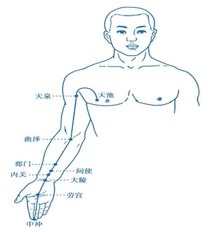 天泉曲腋下二寸,曲泽肘内横纹端,