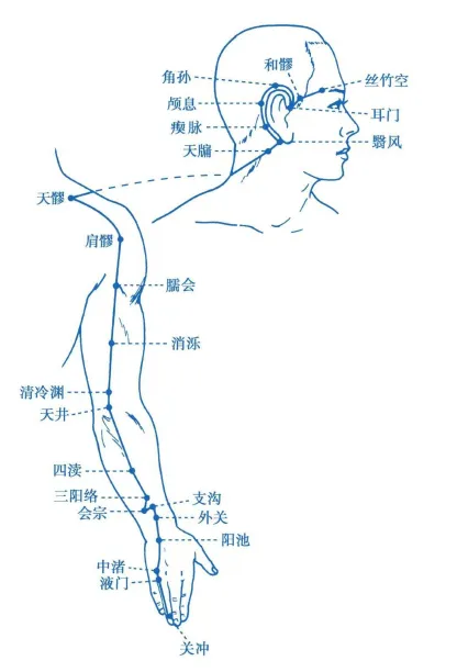 五腧穴:关冲(井)液门(荥)中渚(输)焦,阳池(原)支沟(经)天井(合)索。