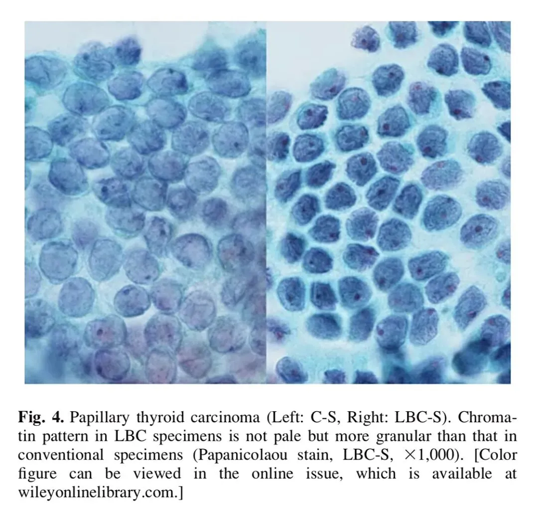 上图:甲状腺乳头状癌(左侧:传统涂片,右侧:液基细胞学标本)。液基细胞学标本中的染色质模式并非苍白样,而是比传统涂片更具颗粒感(巴氏染色,液基细胞学标本,×1000)。