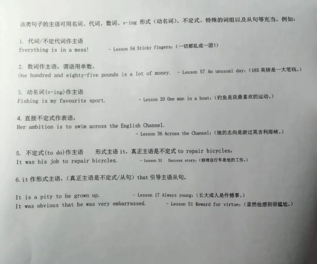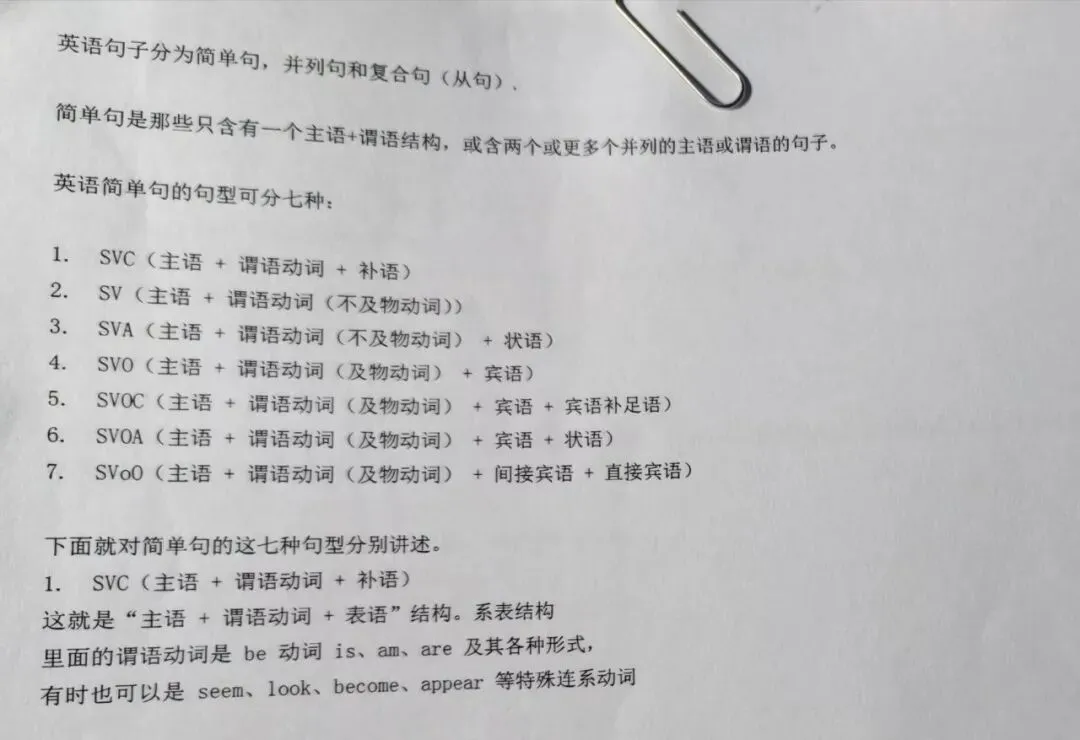 学习资料是我自己编写的。并不是通常意义上的一课一课的学习,而是将新概念第2册的96篇课文打乱,重新编辑,以同类句型编为一组,结合此类句型的语法知识学习。以课文句型带动语法的学习,为避免挂一漏万,争取将课文中出现的所有句子都嚢括进去,也就是说,每一个句子都会分析它的语法现象,不管是简单句,并列句还是复合句。当然从简单句开始吧。其实简单句也并不简单,要深挖其中的语法也是有很多东西要学的。今天学的是第一小节:简单句七种类型中的第一种,主语+谓语动词(连系动词)+表语。