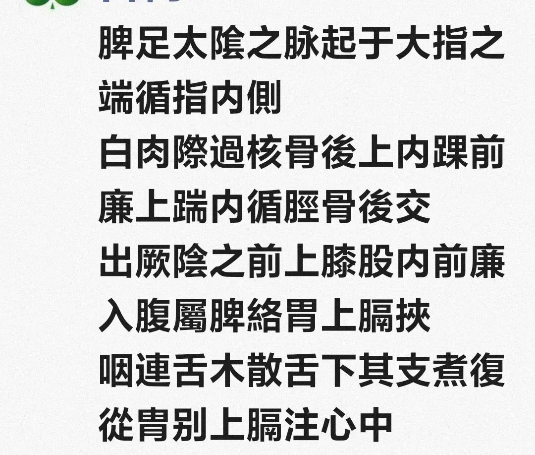 - 补充:中医十二经脉中,每条经都以“脏腑+手足+阴阳”命名,“脾足太阴”即这条经属脾、走下肢、为阴经。